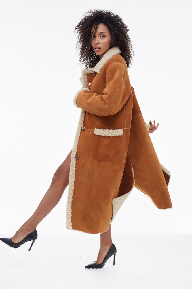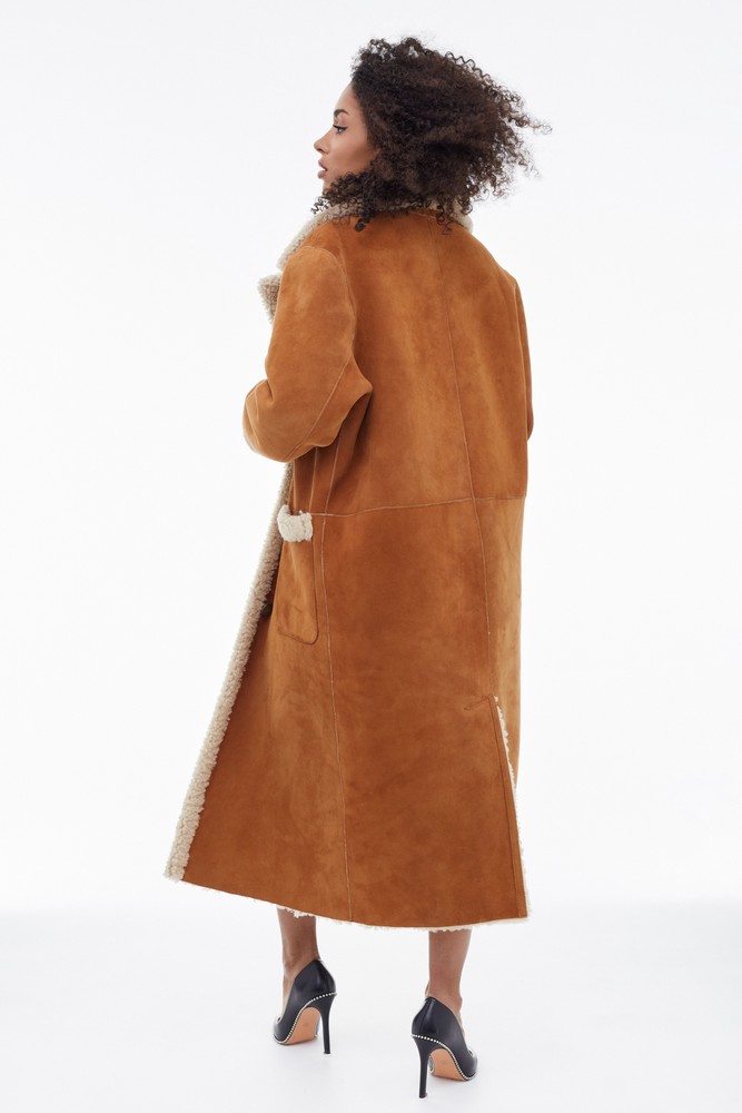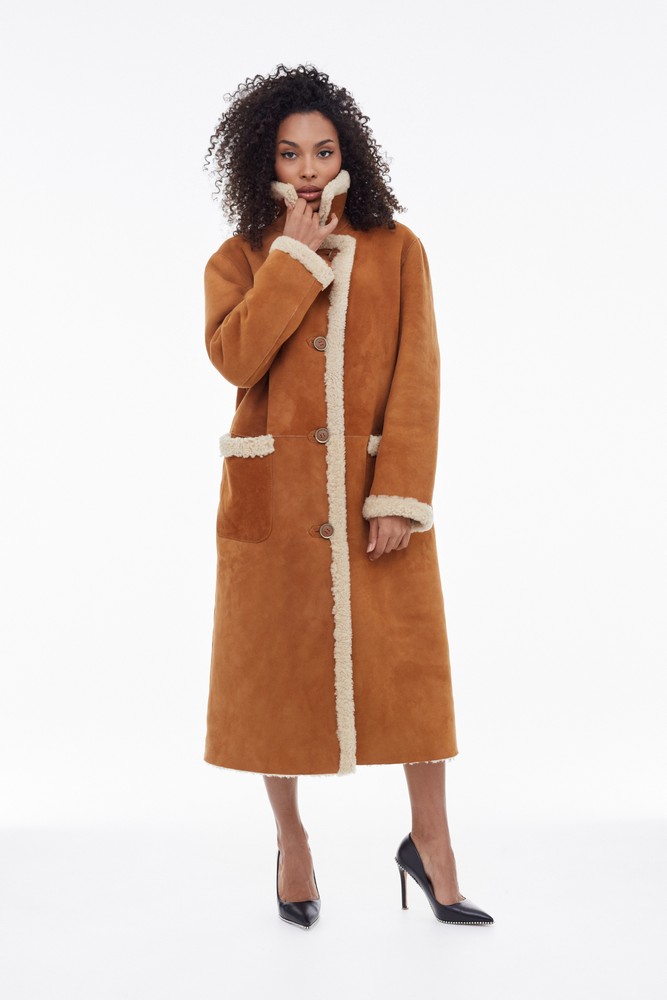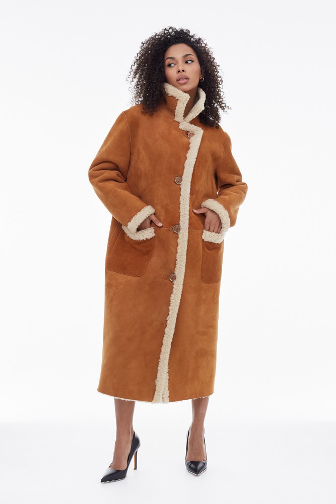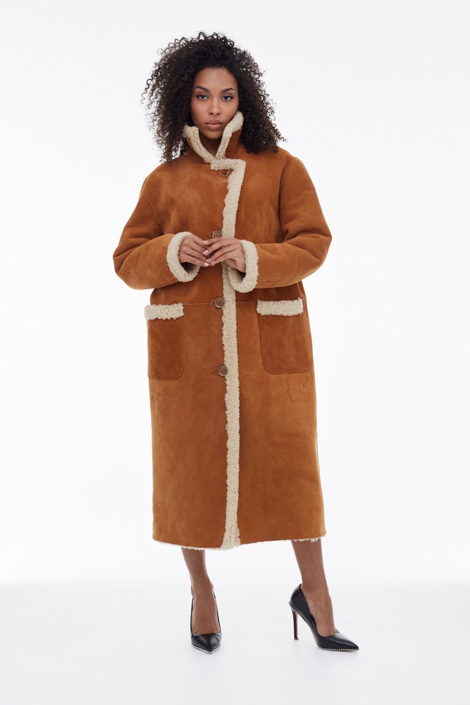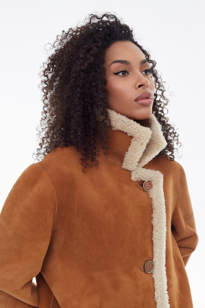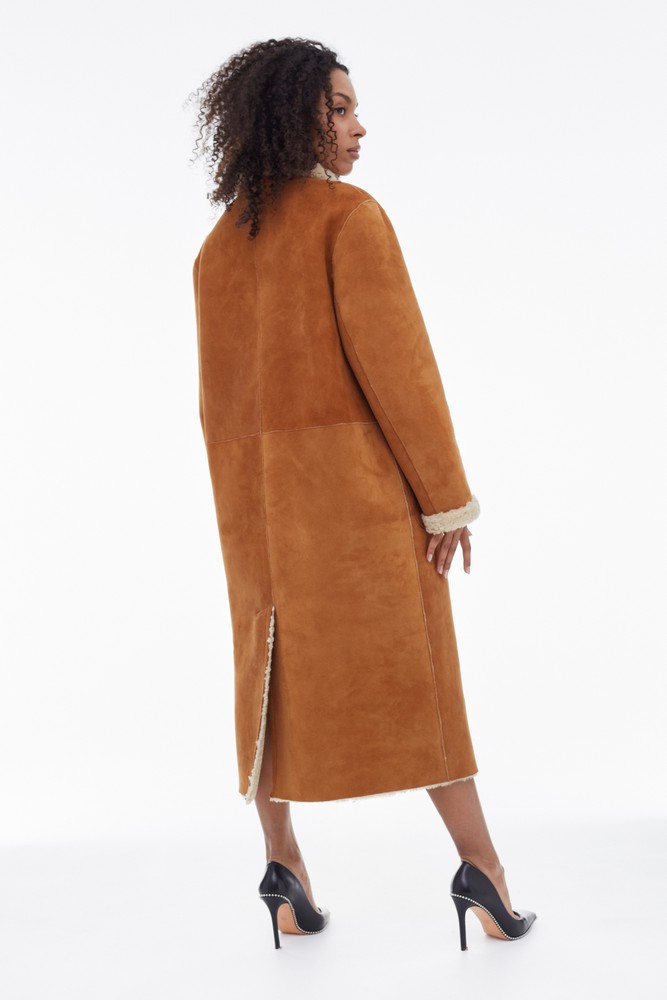 Orange sheepskin coat with high collar
