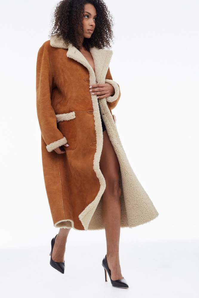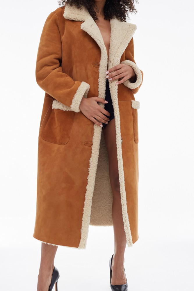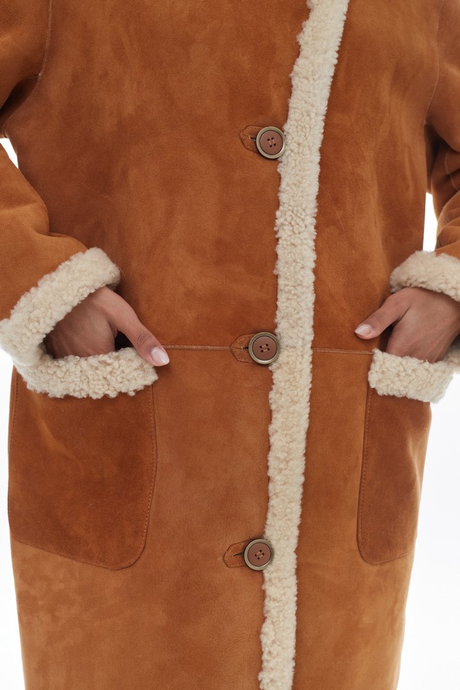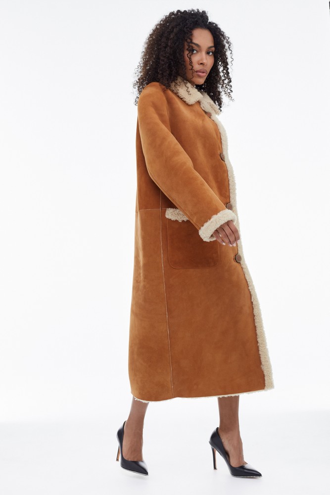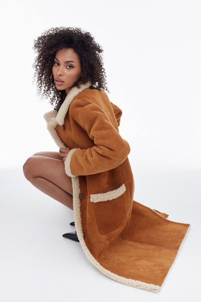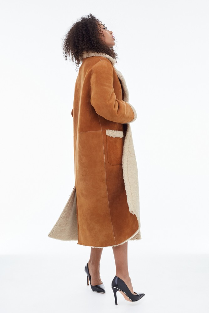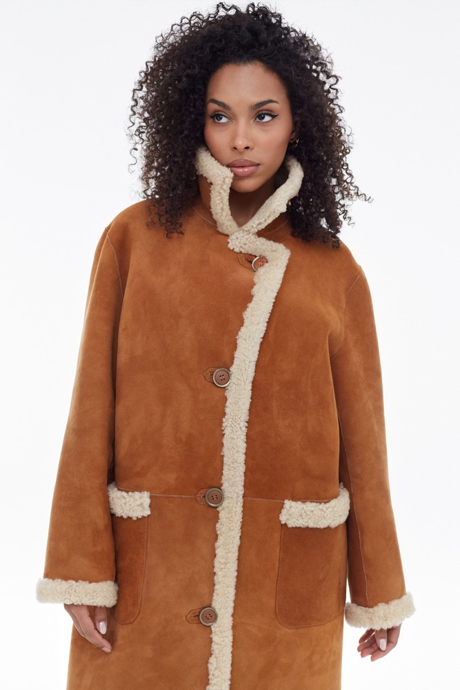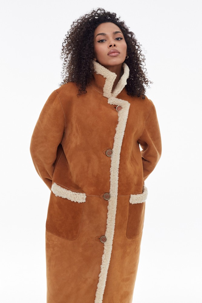 Orange sheepskin coat with high collar