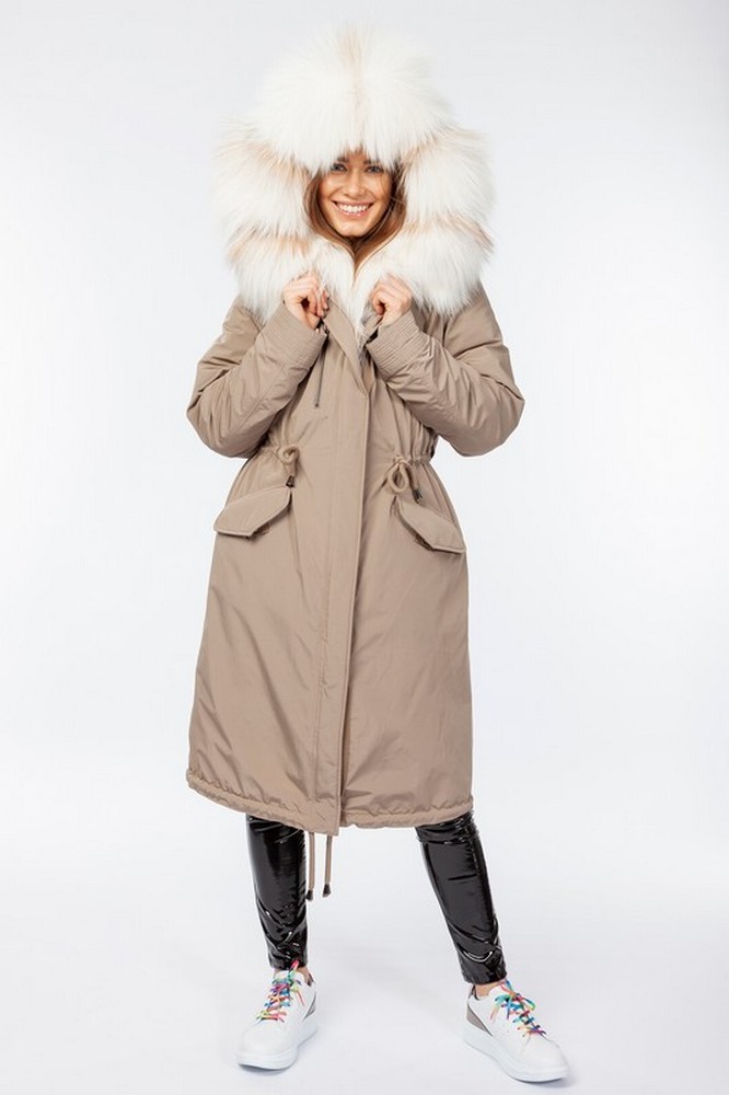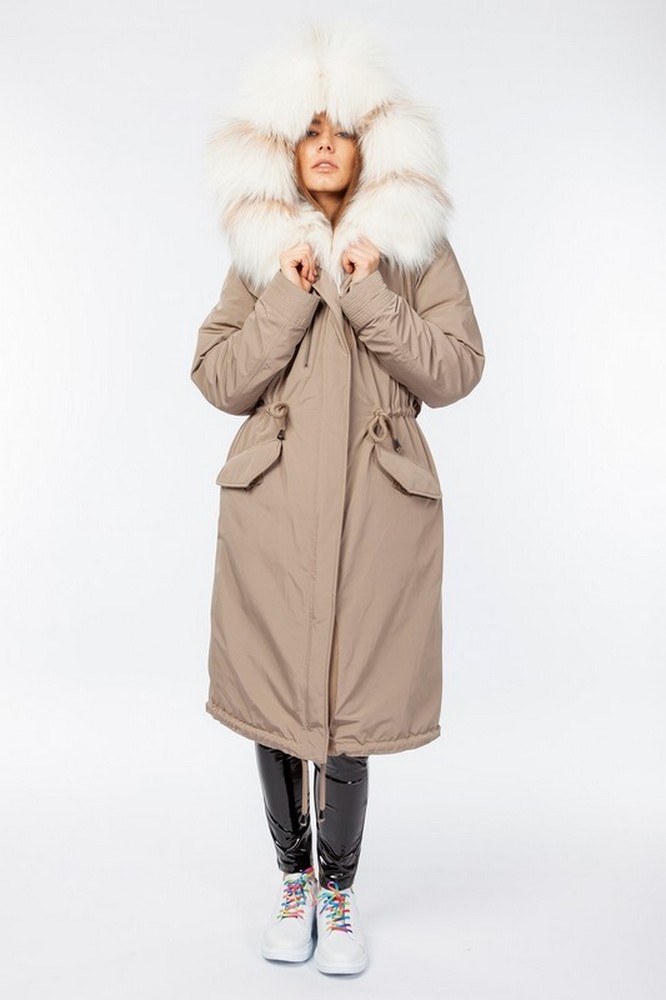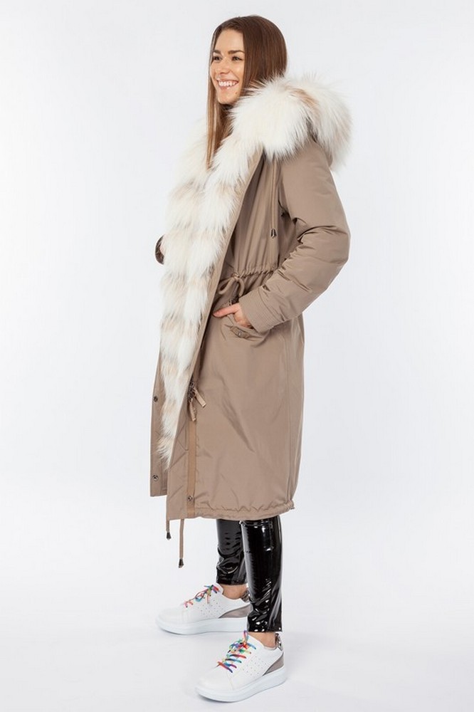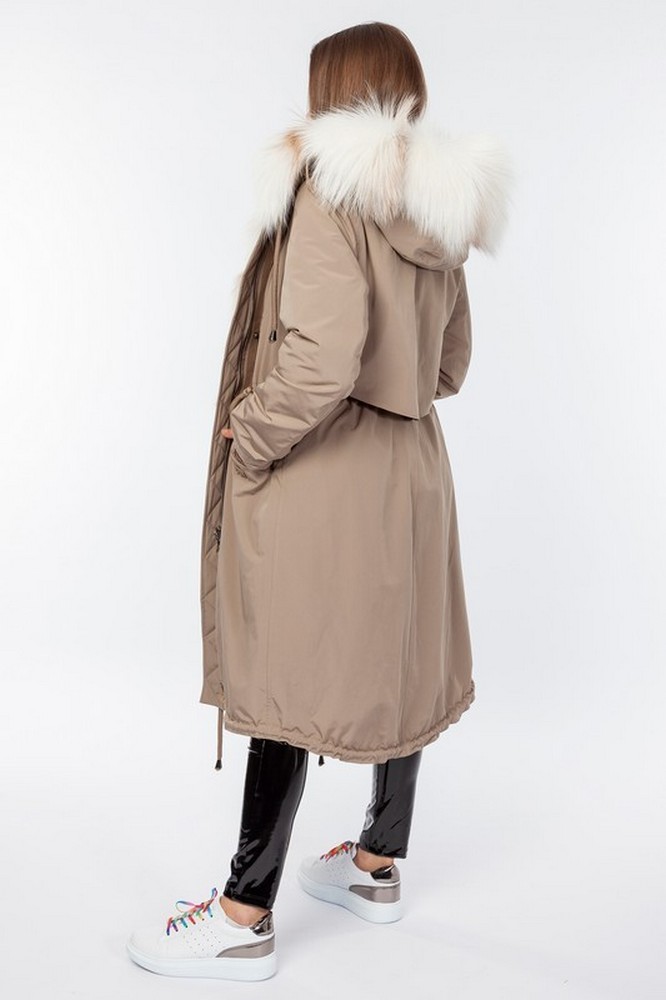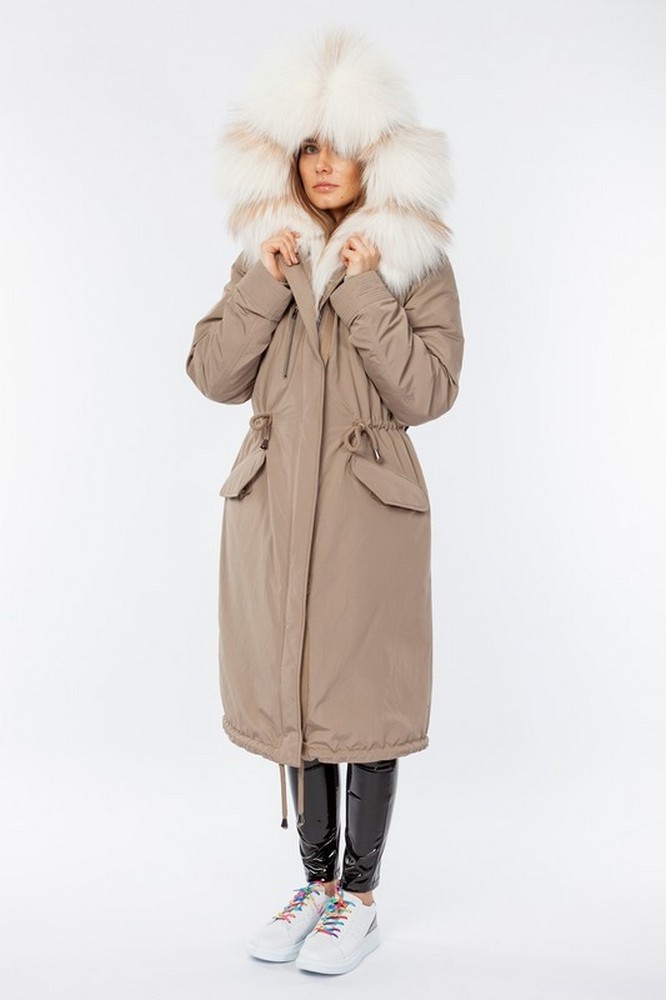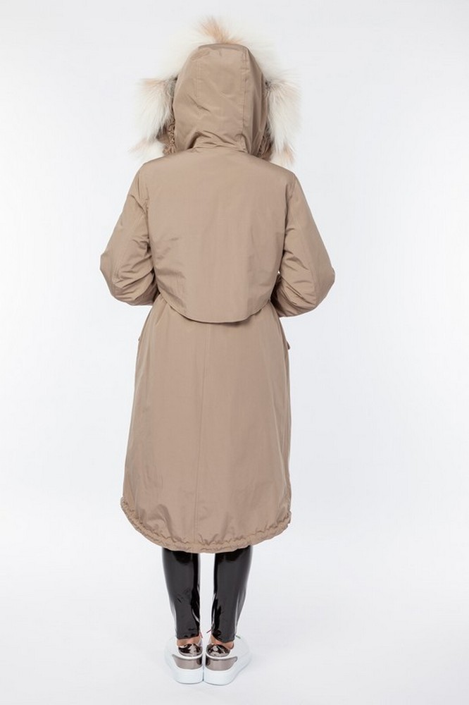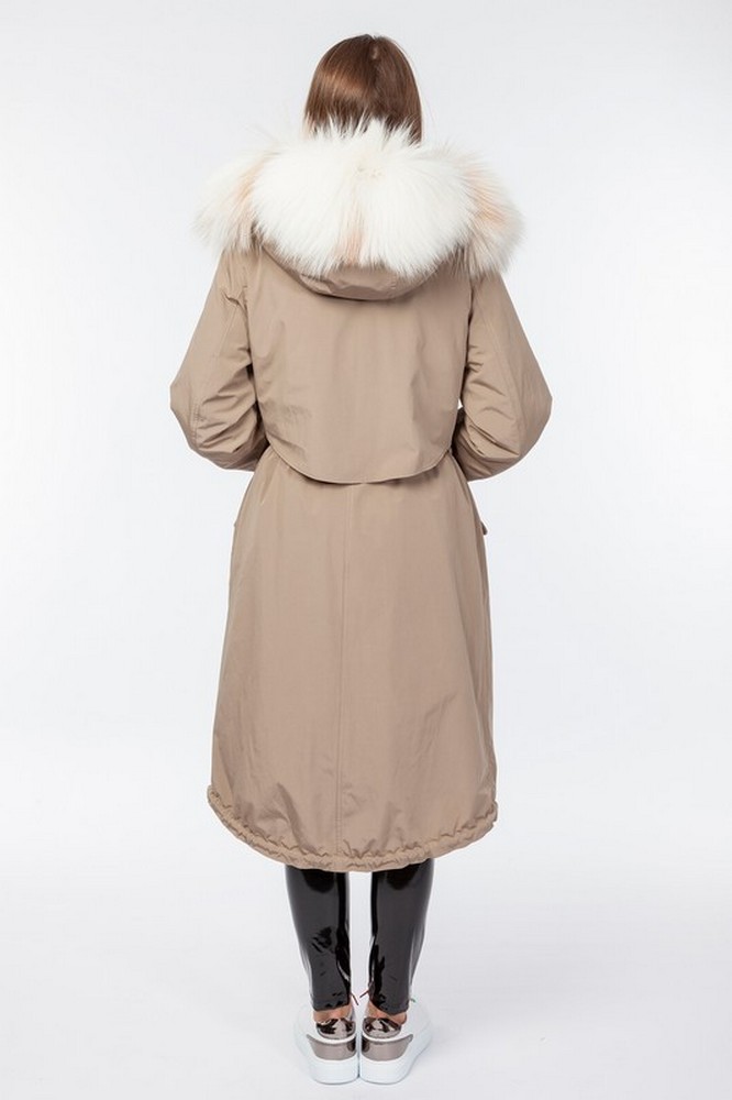 The fur hood and insulation are detachable on a secret lightning.