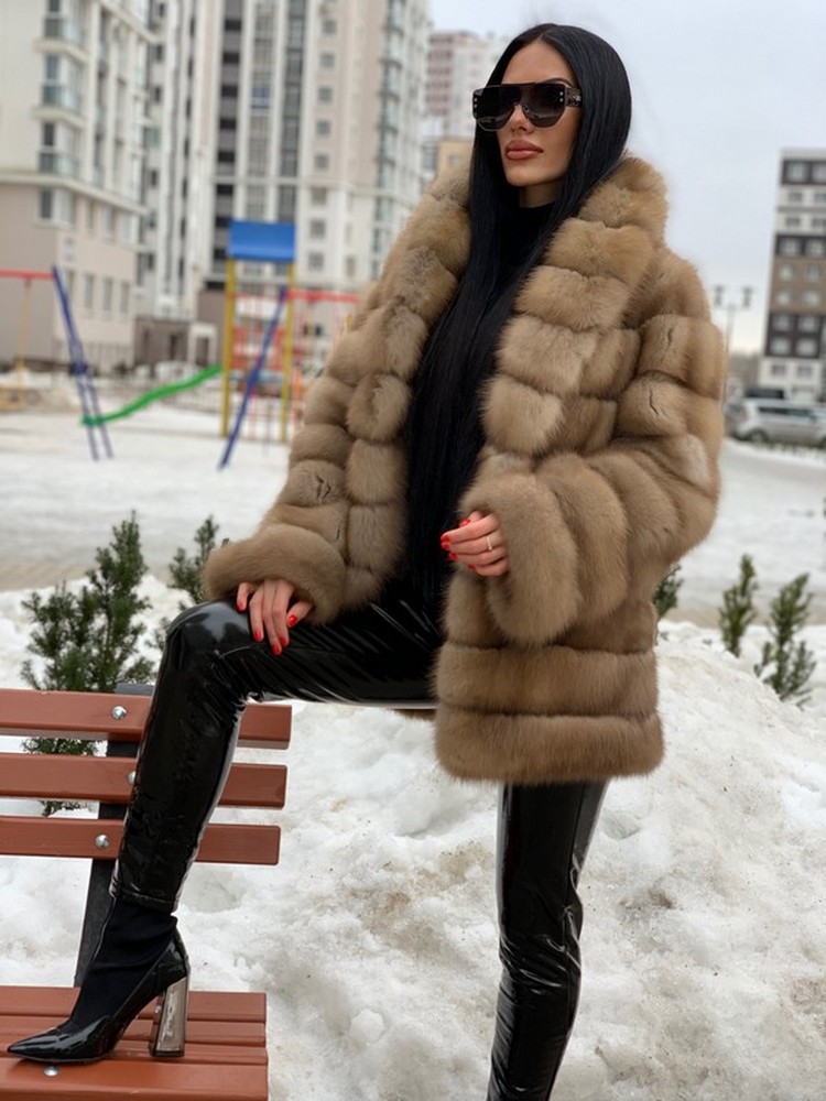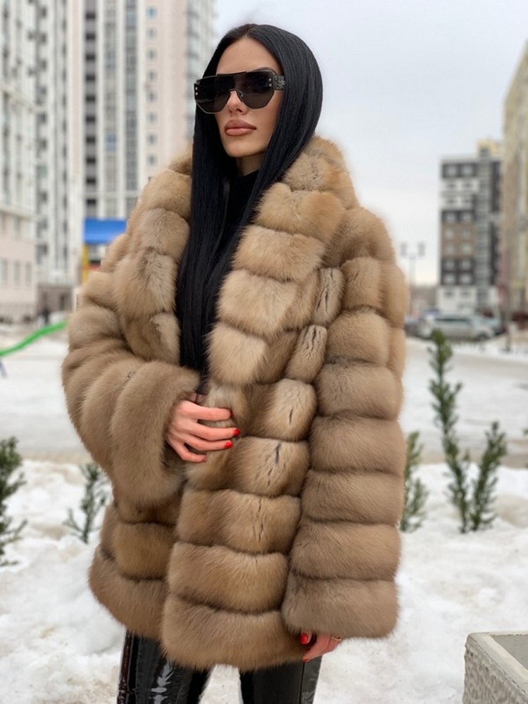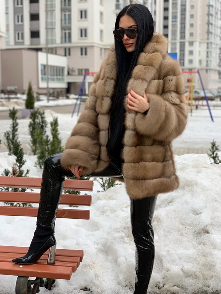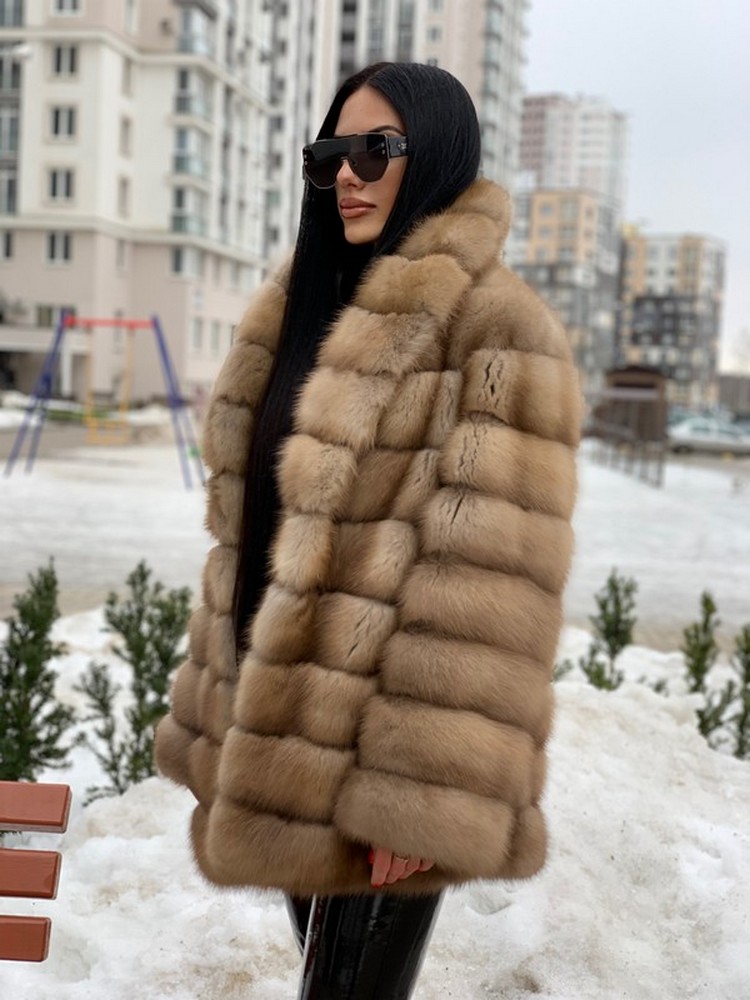 Transverse fur layout. Horizontal pockets with magnets. Shawl collar.