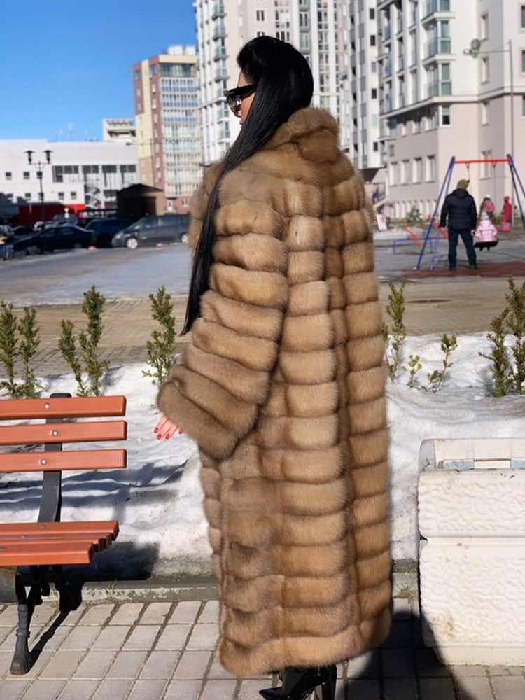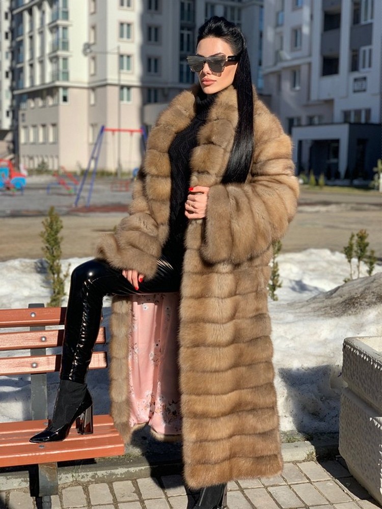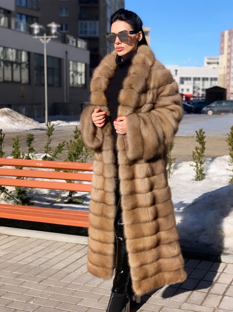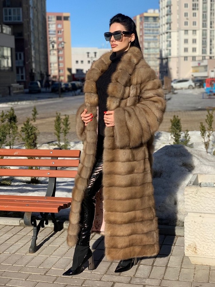 Transverse fur layout. Horizontal pockets with magnets. Shawl collar.