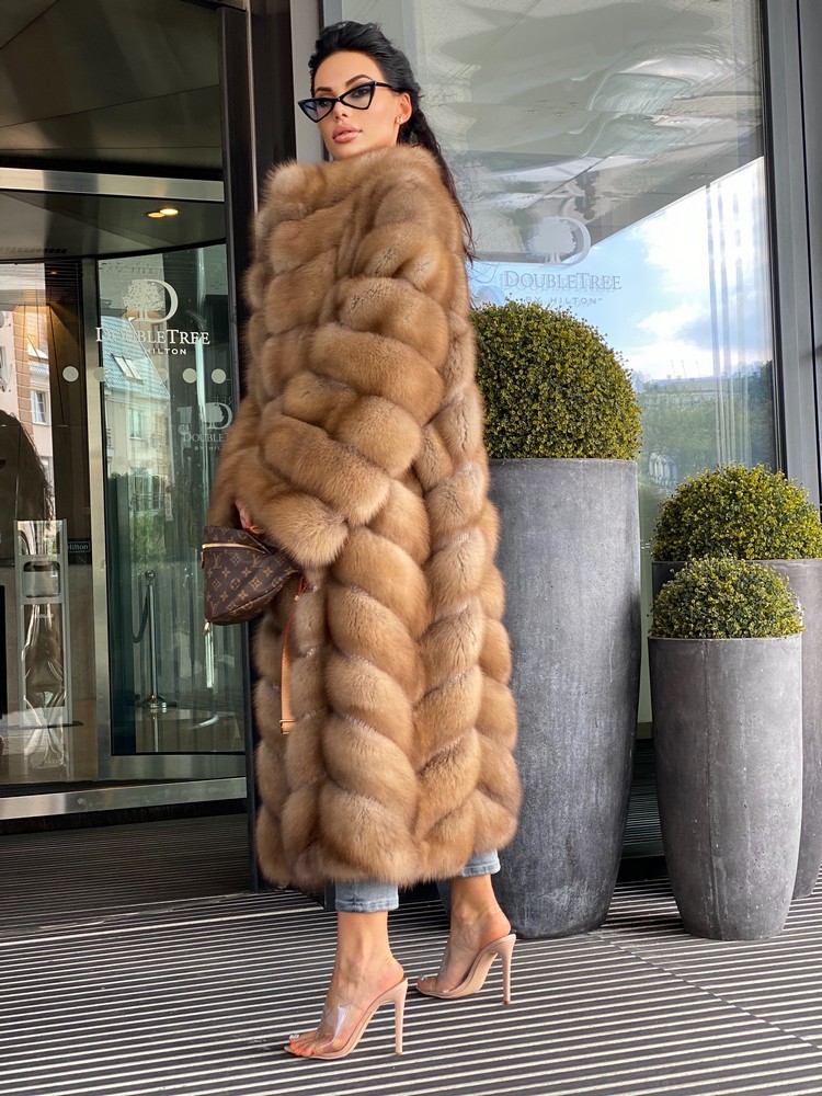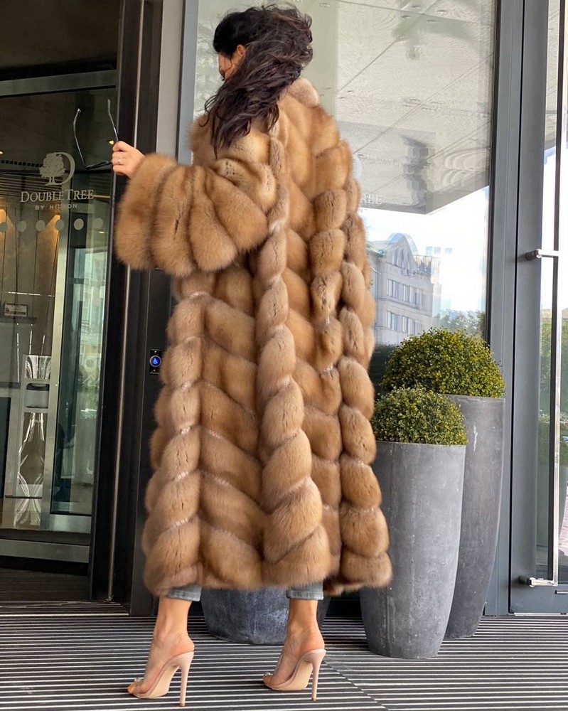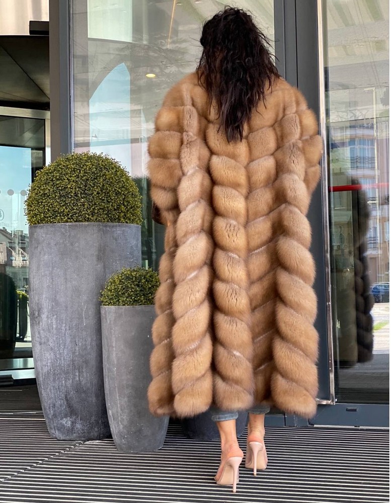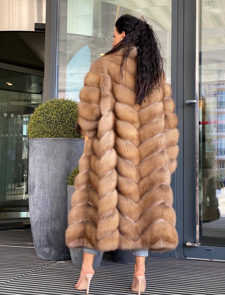 Diagonal fur layout (herringbone), full sleeves. Horizontal pockets with magnets.