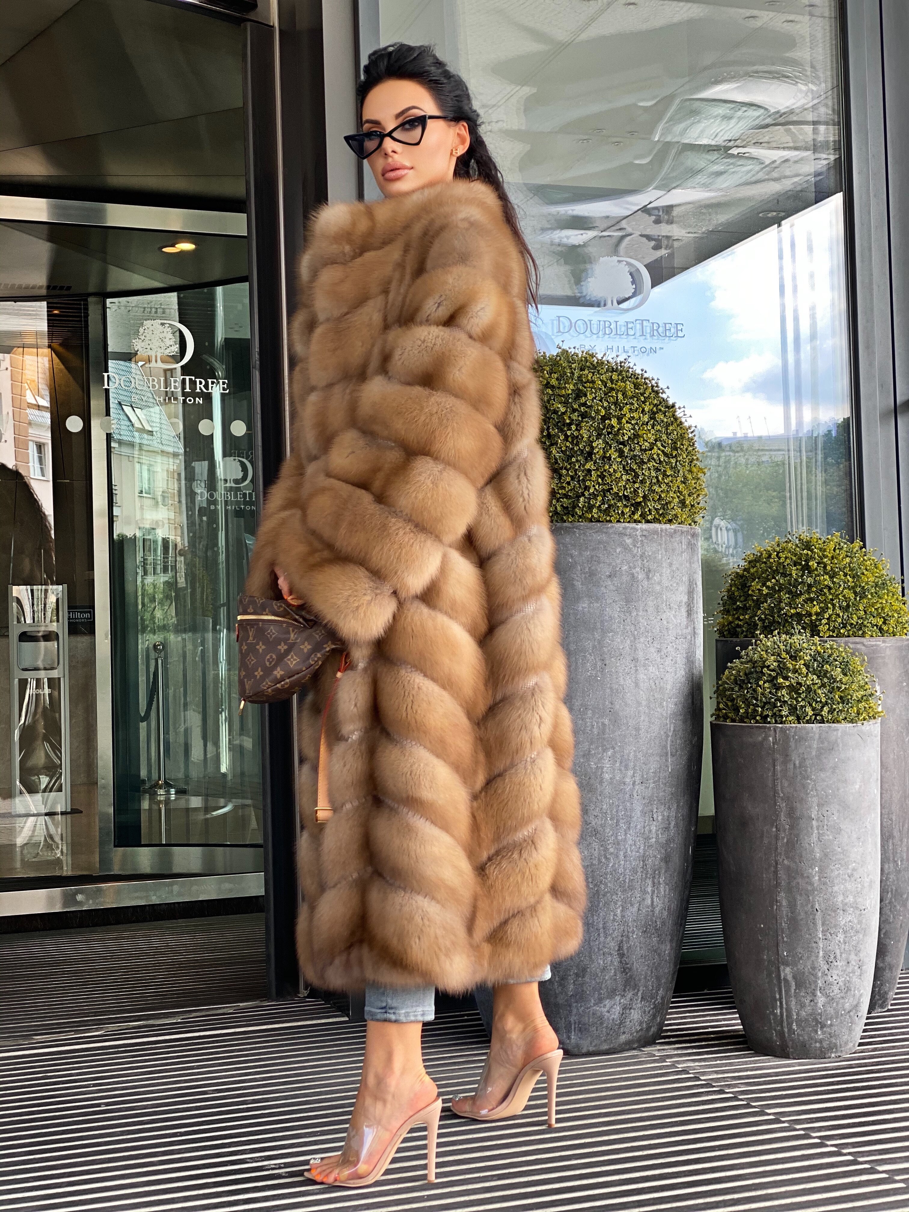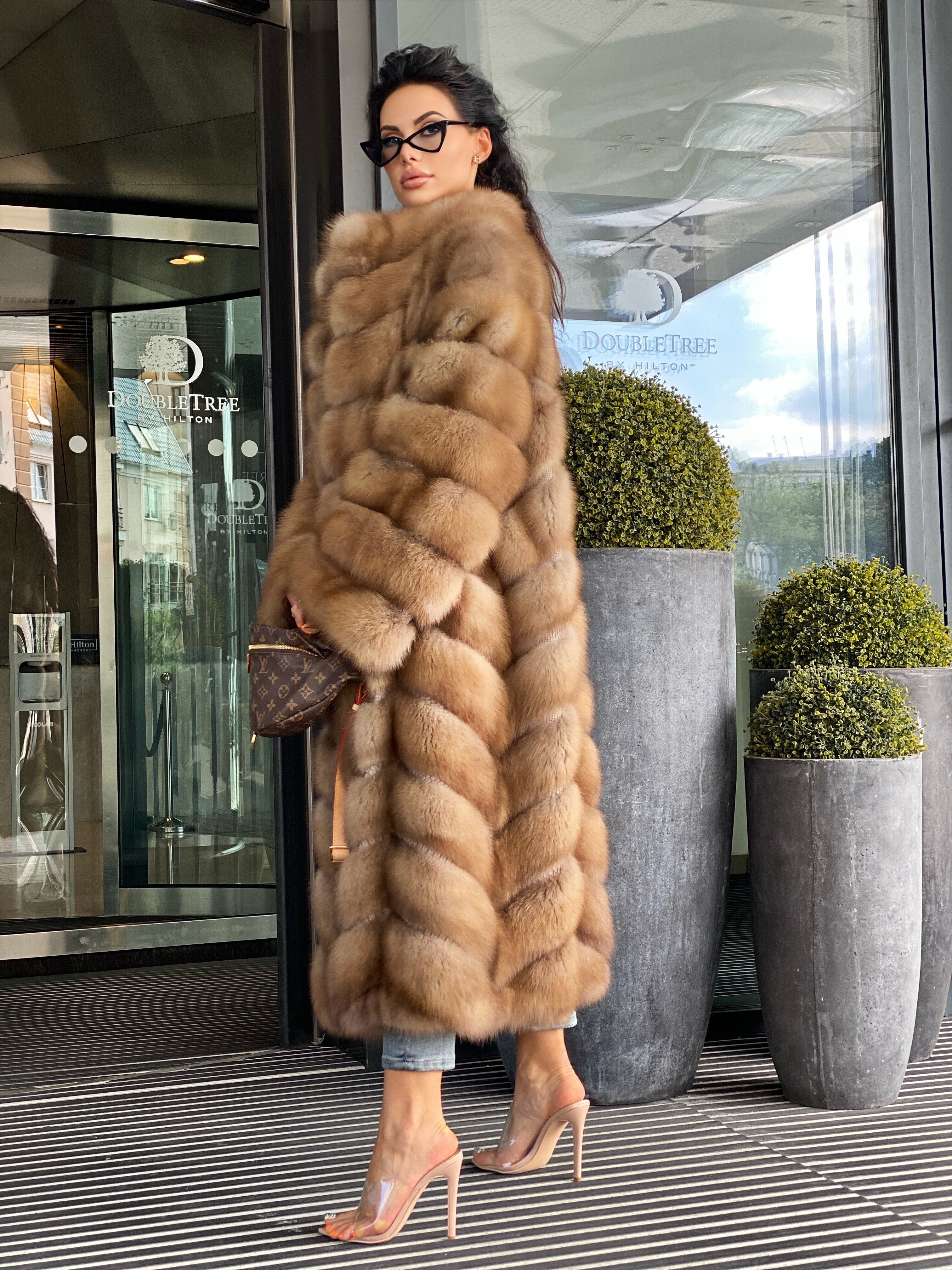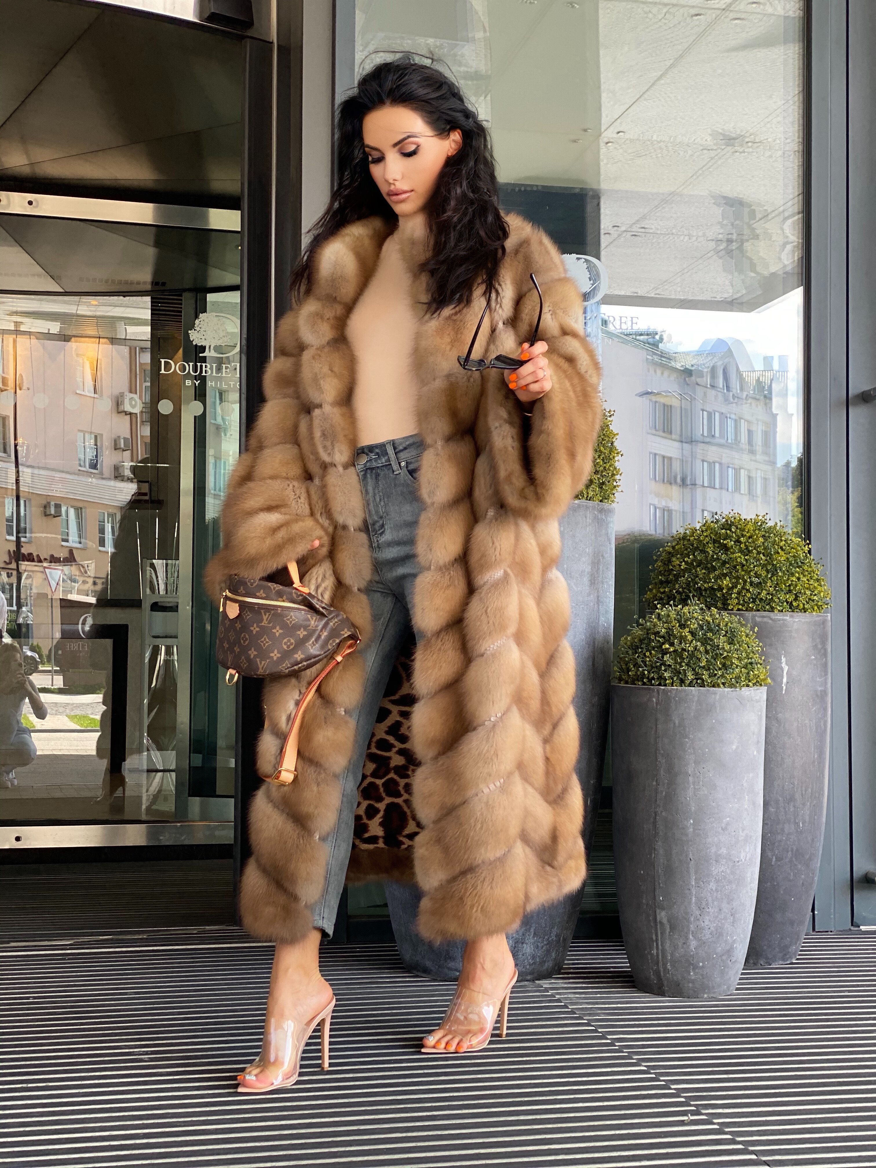 Diagonal fur layout (herringbone), full sleeves. Horizontal pockets with magnets.