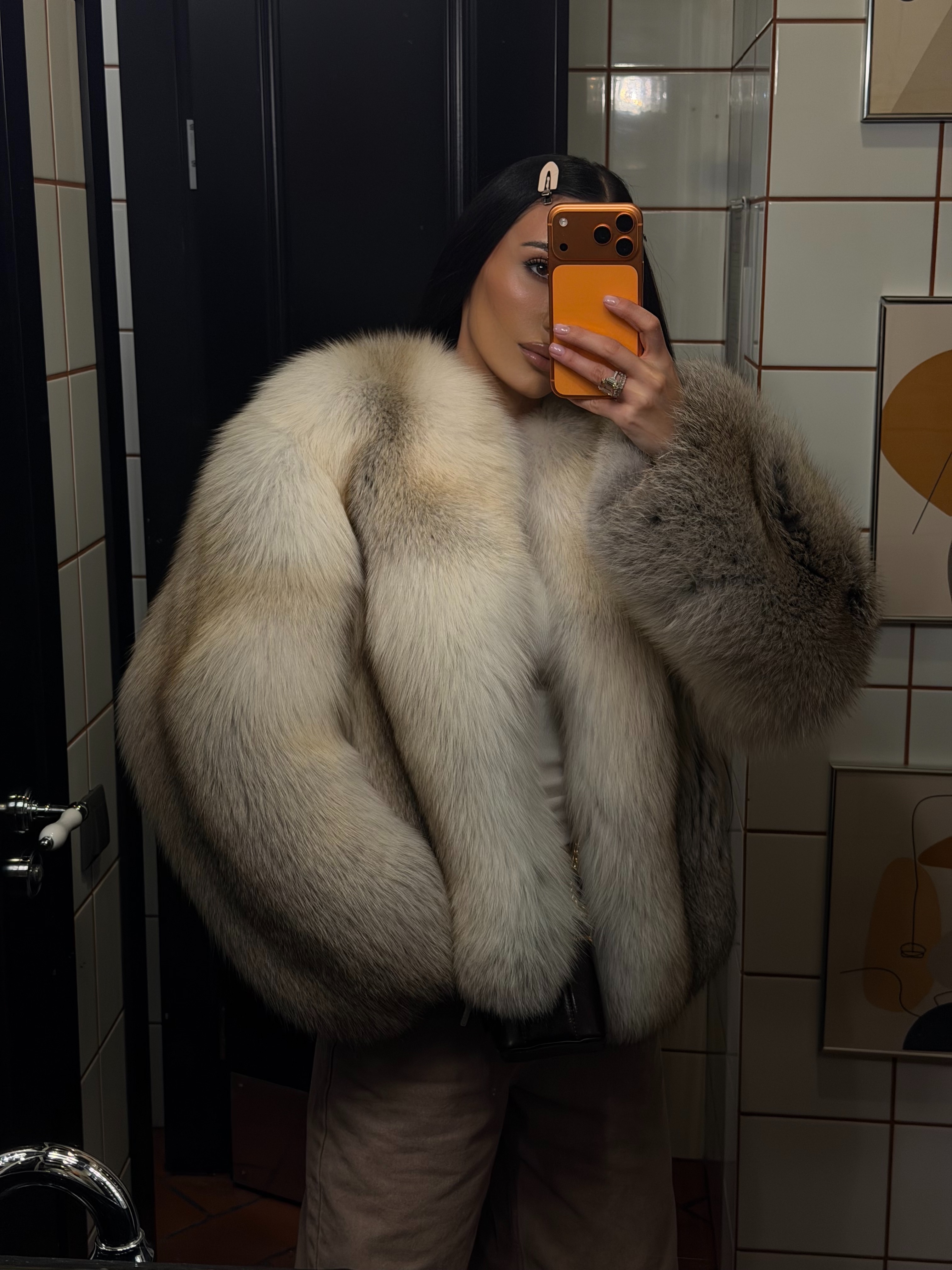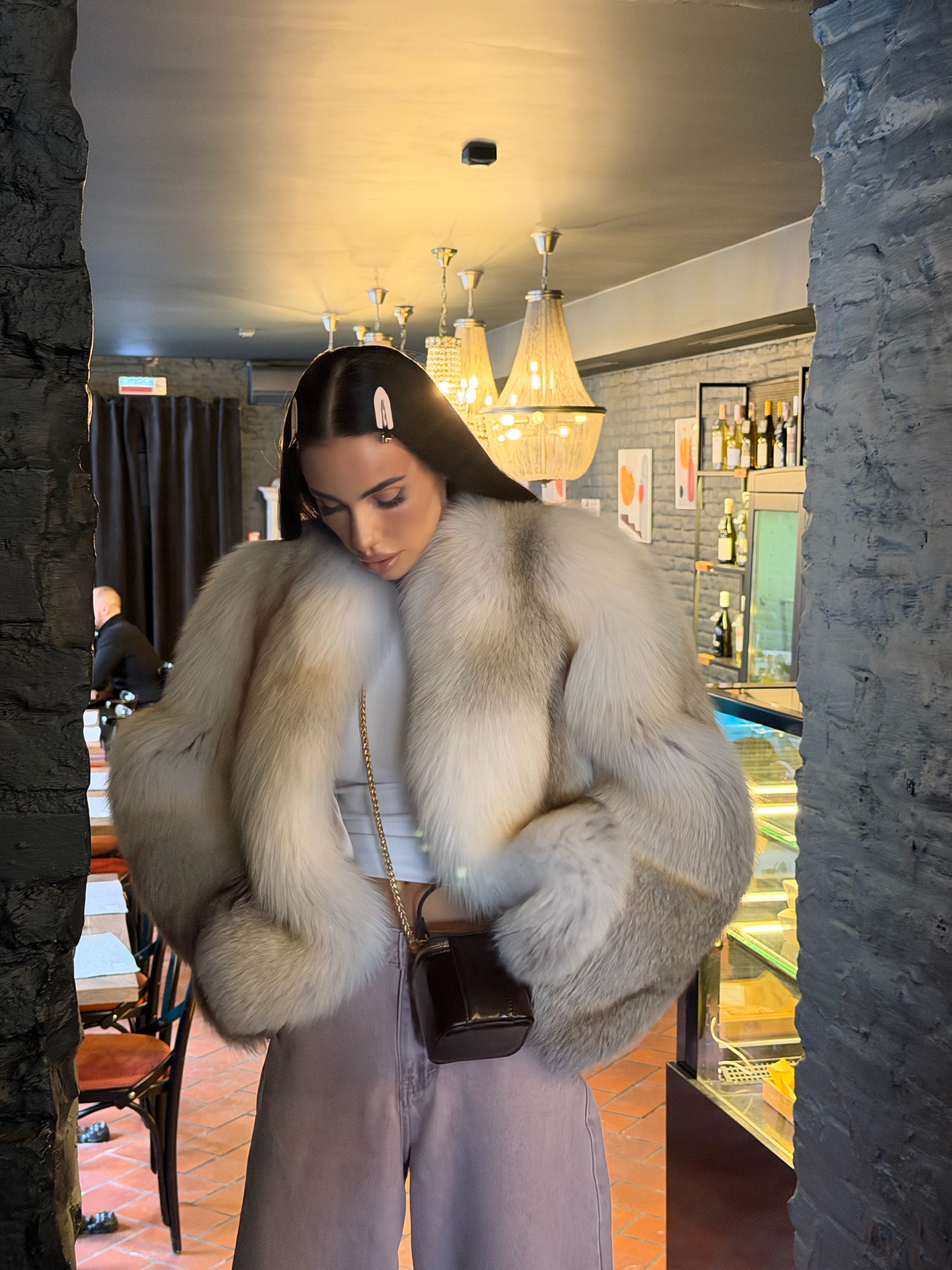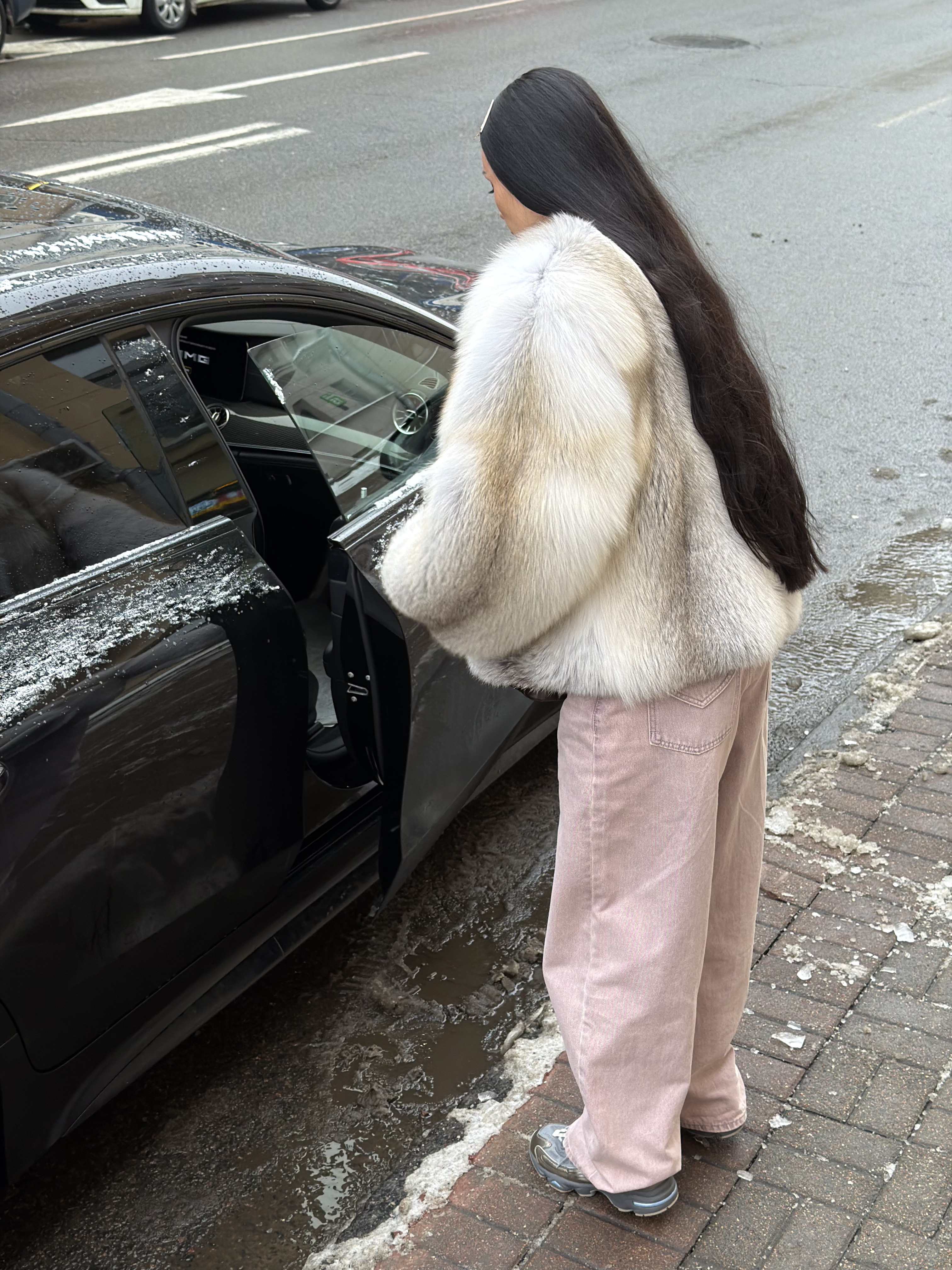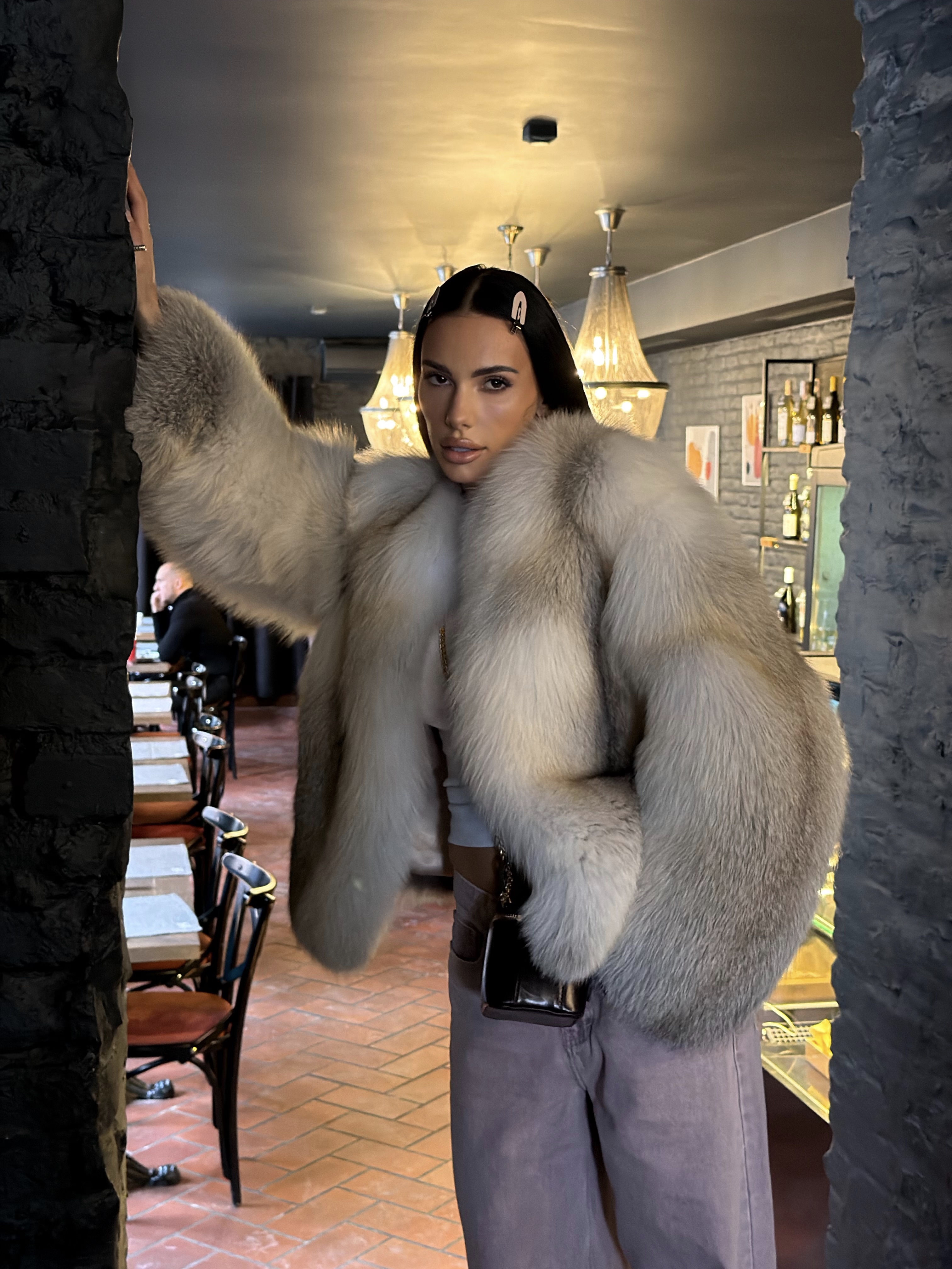 The fur coat is very warm and stylish.