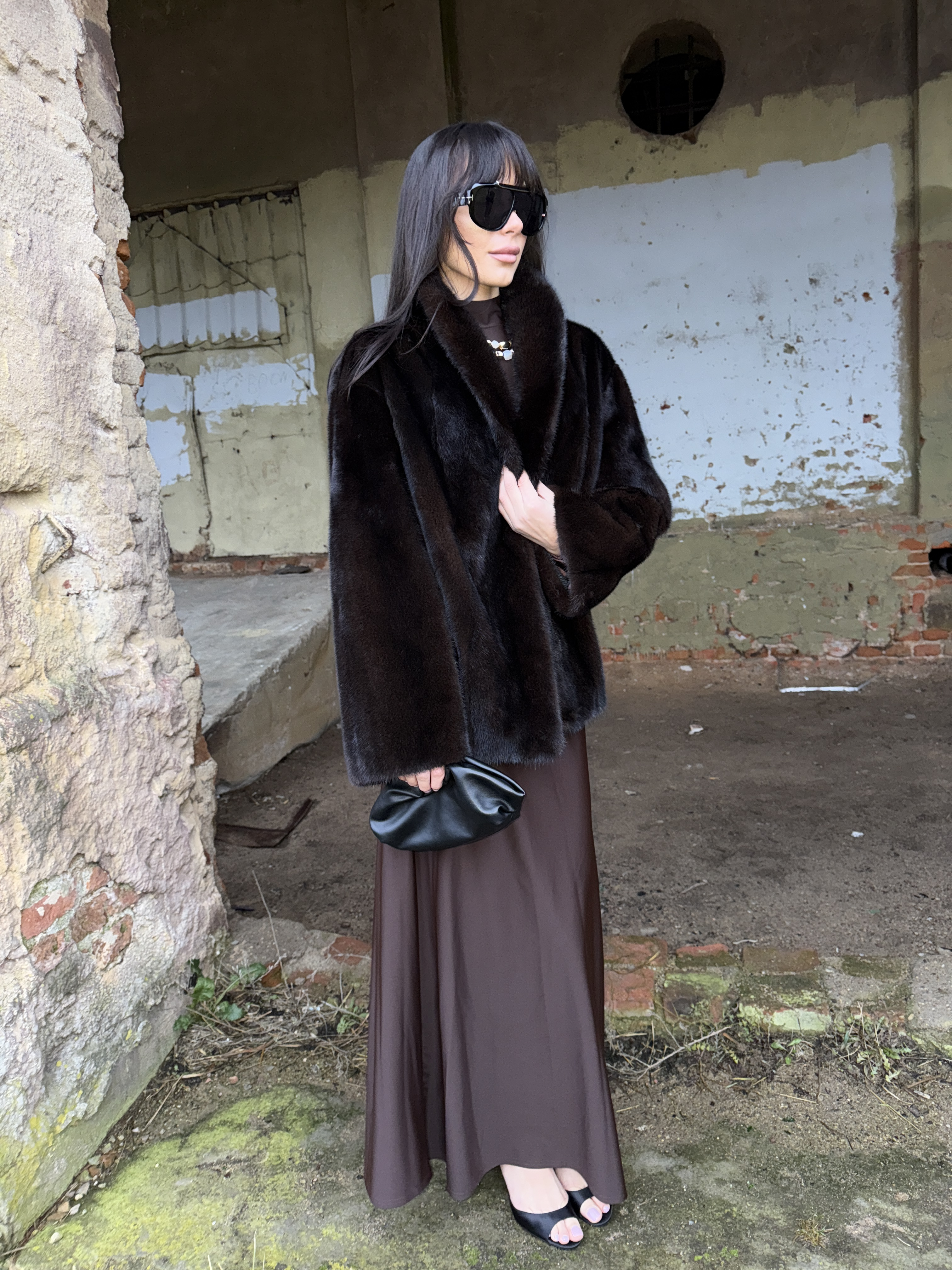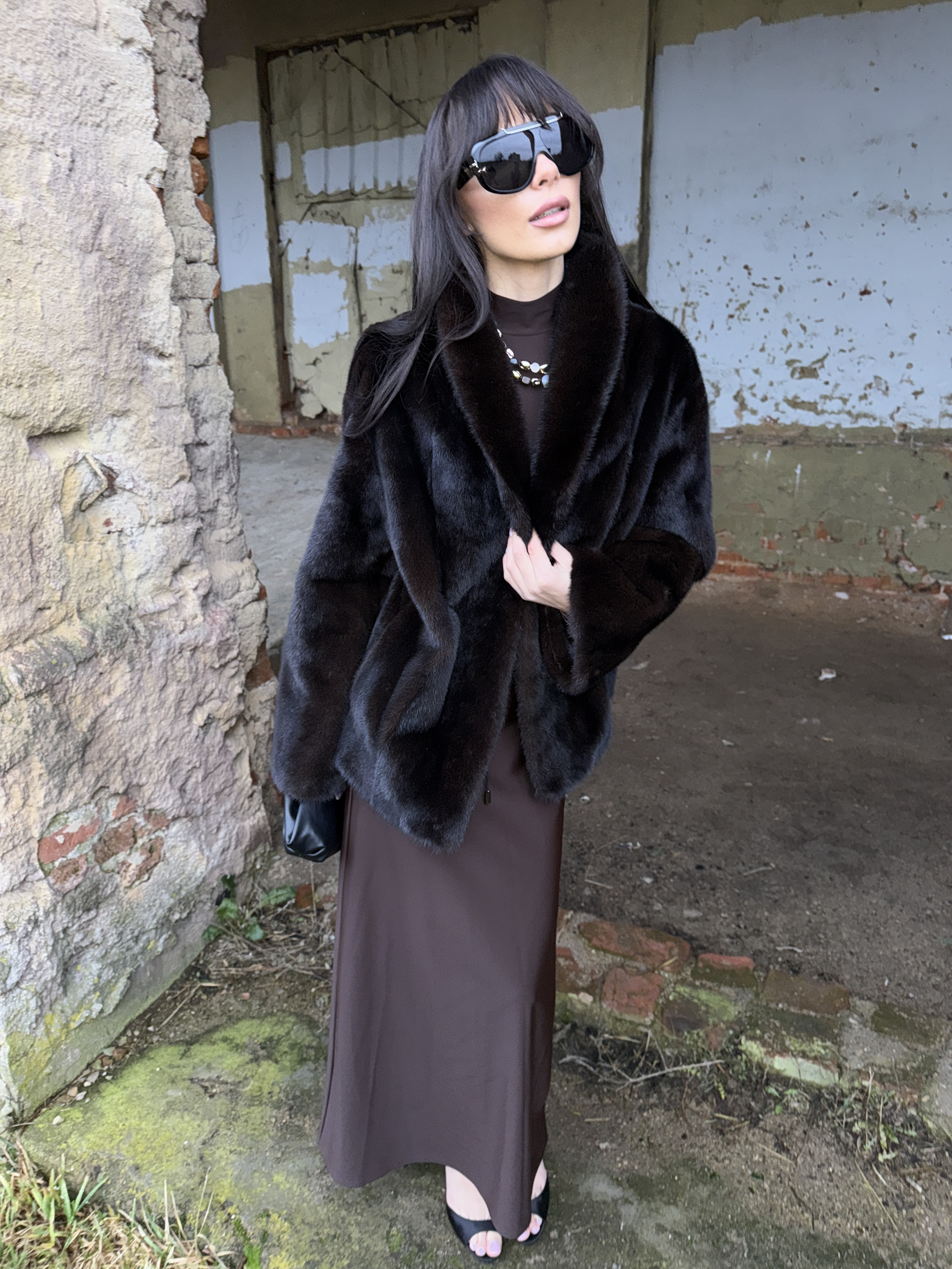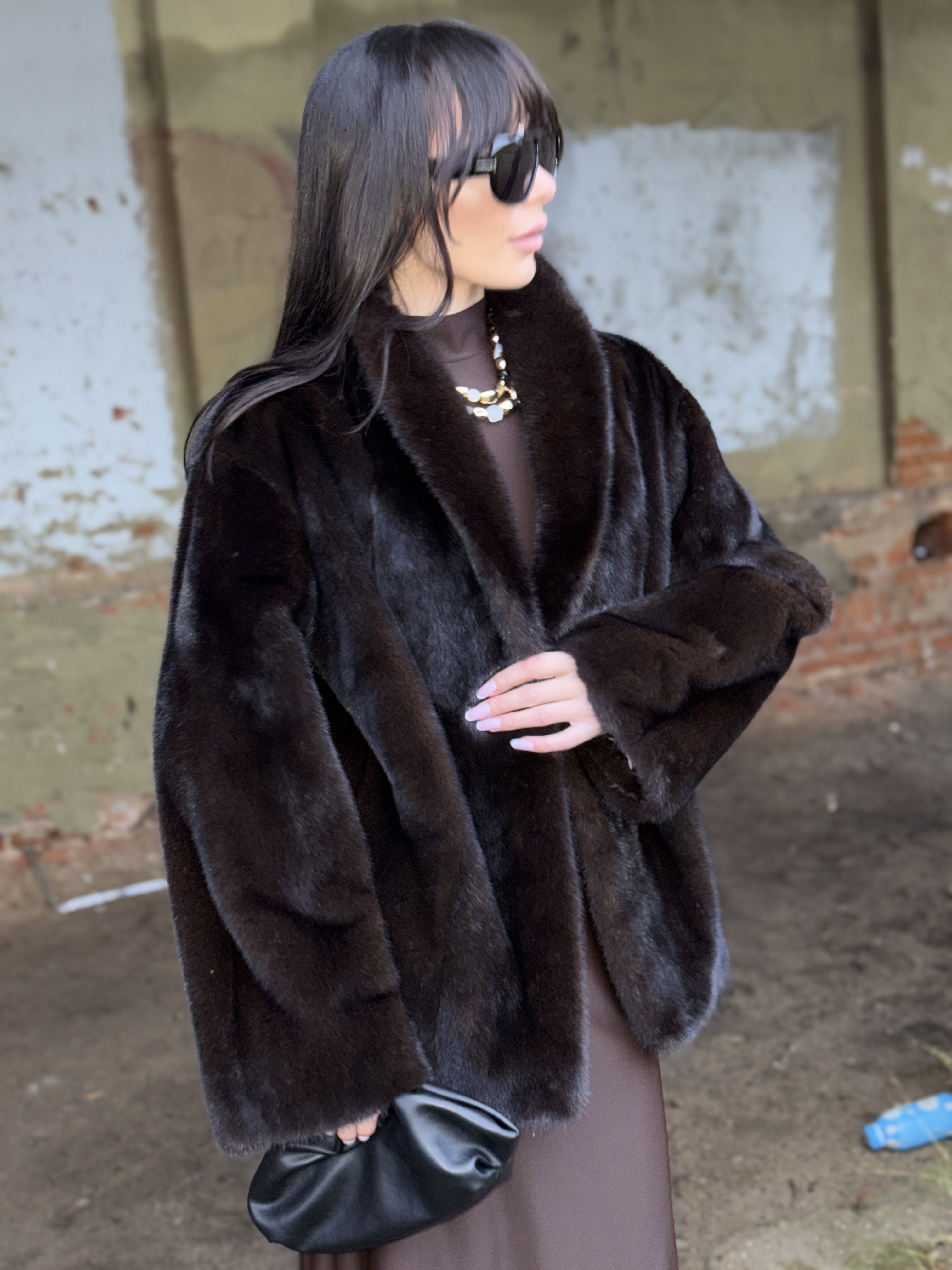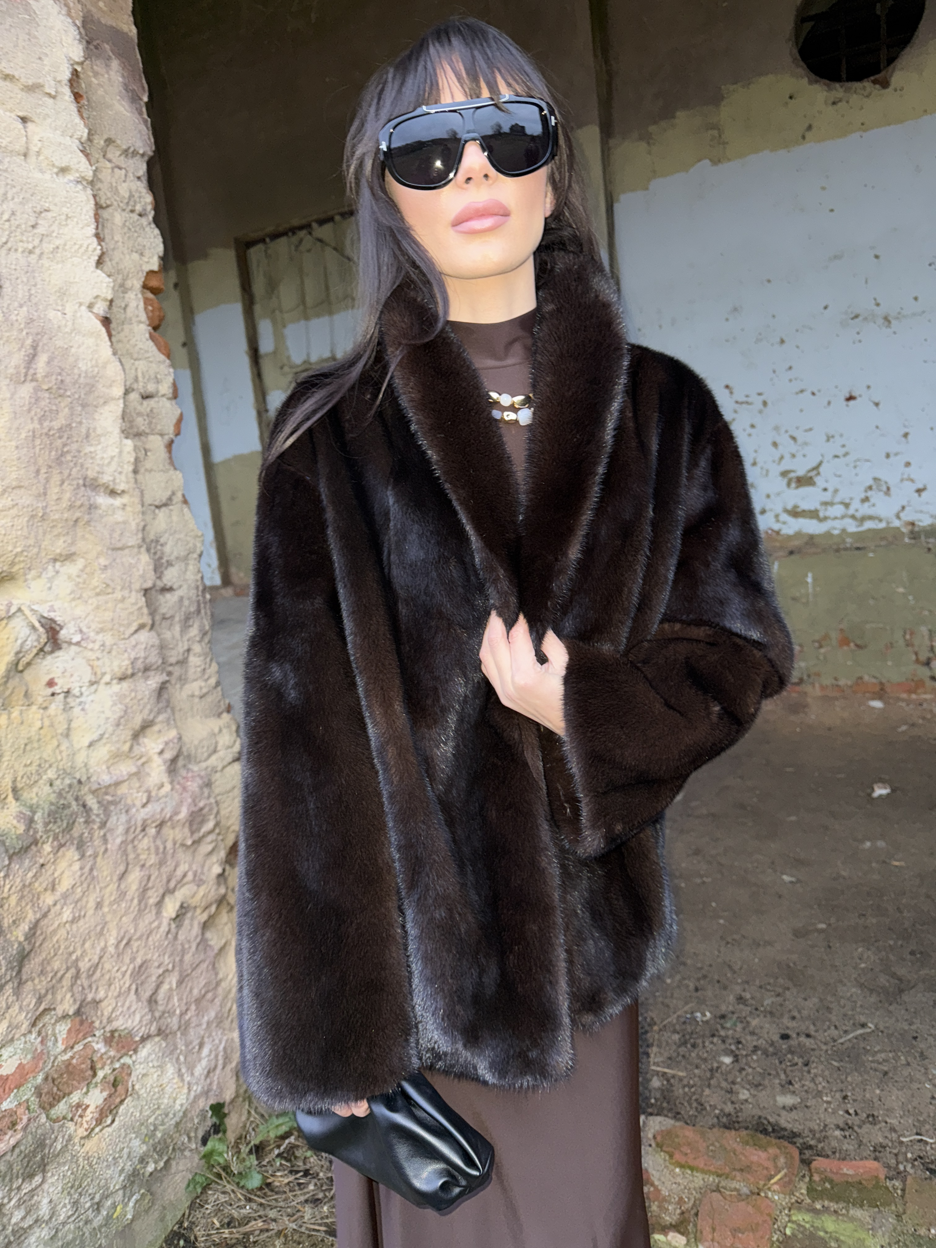Natural mink fur coat in black chocolate color