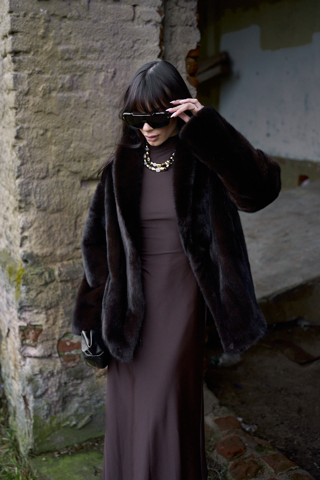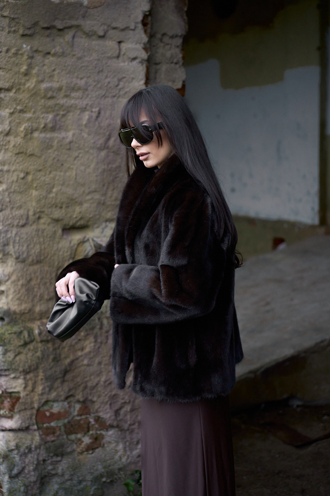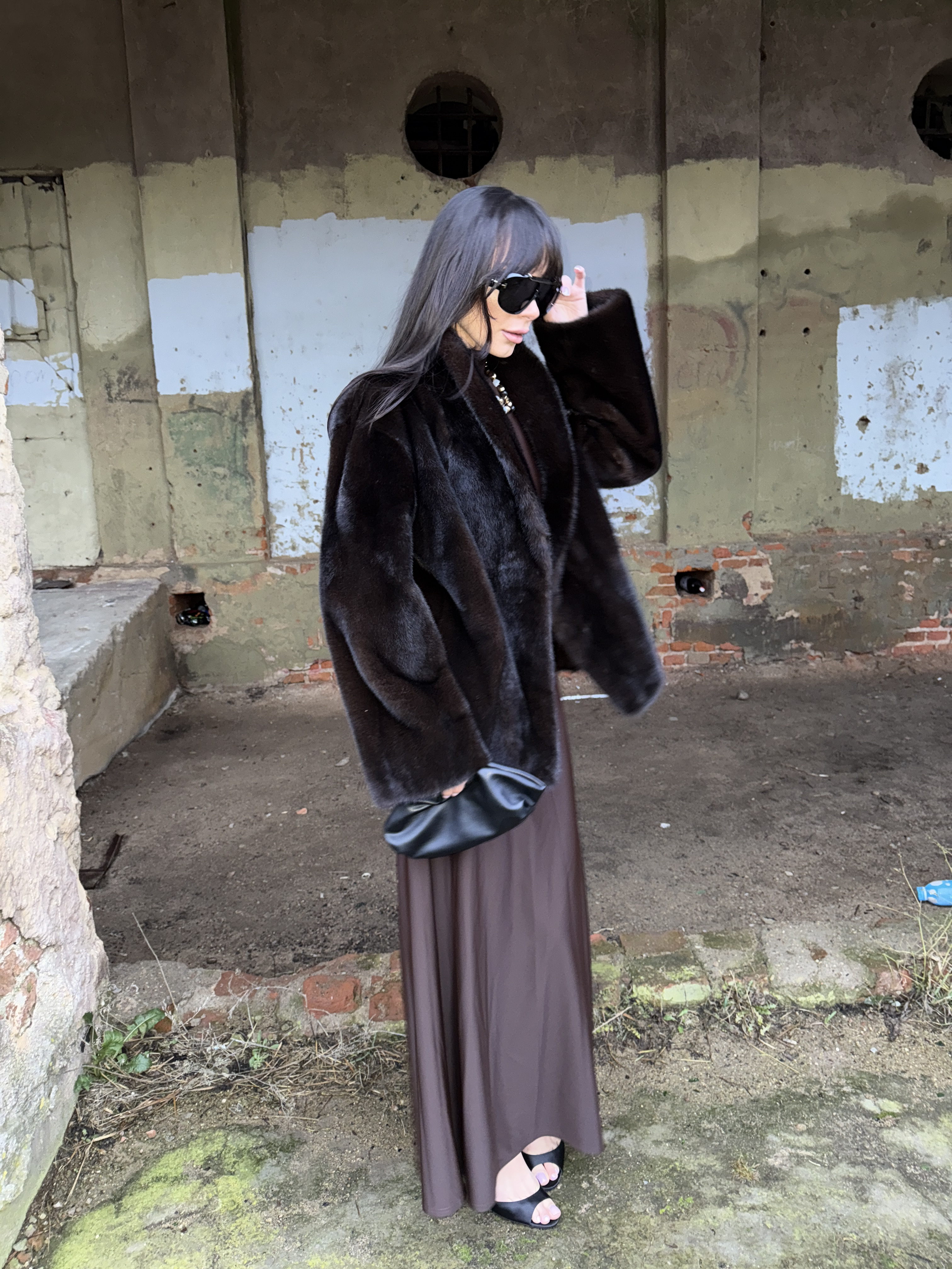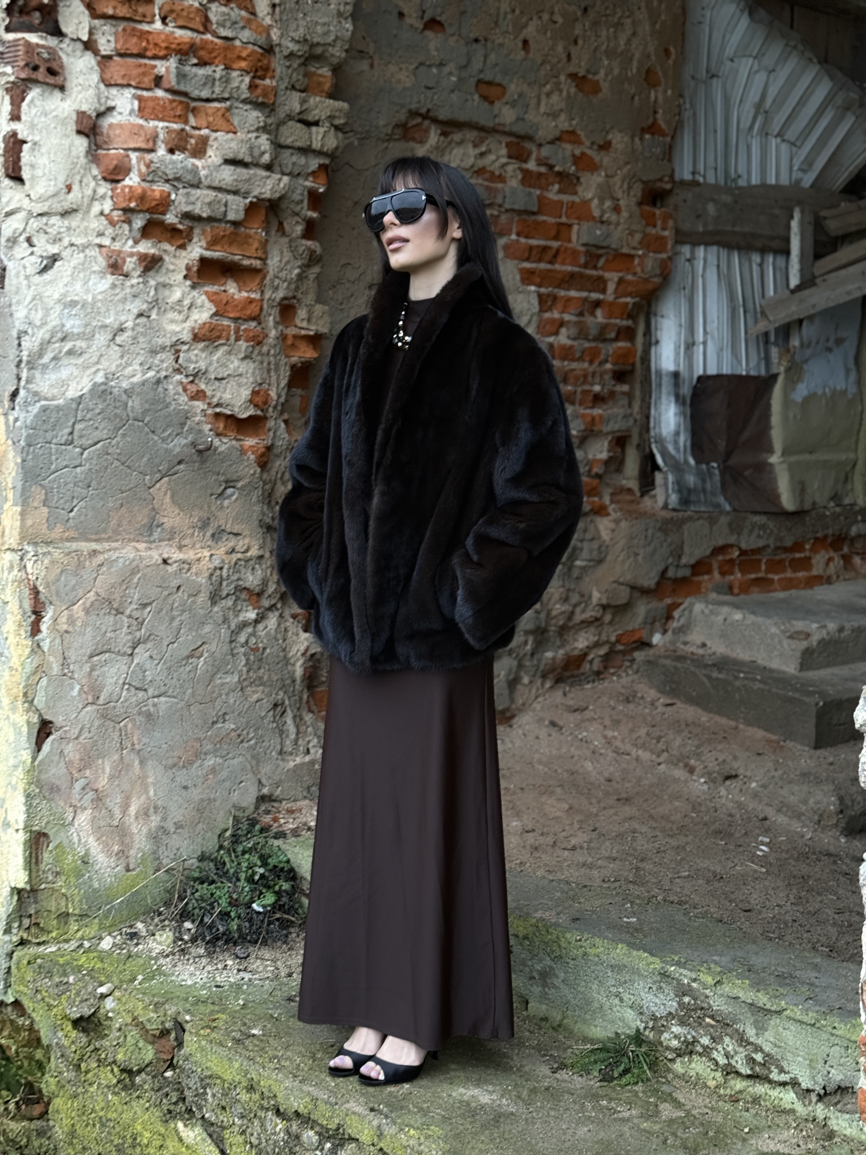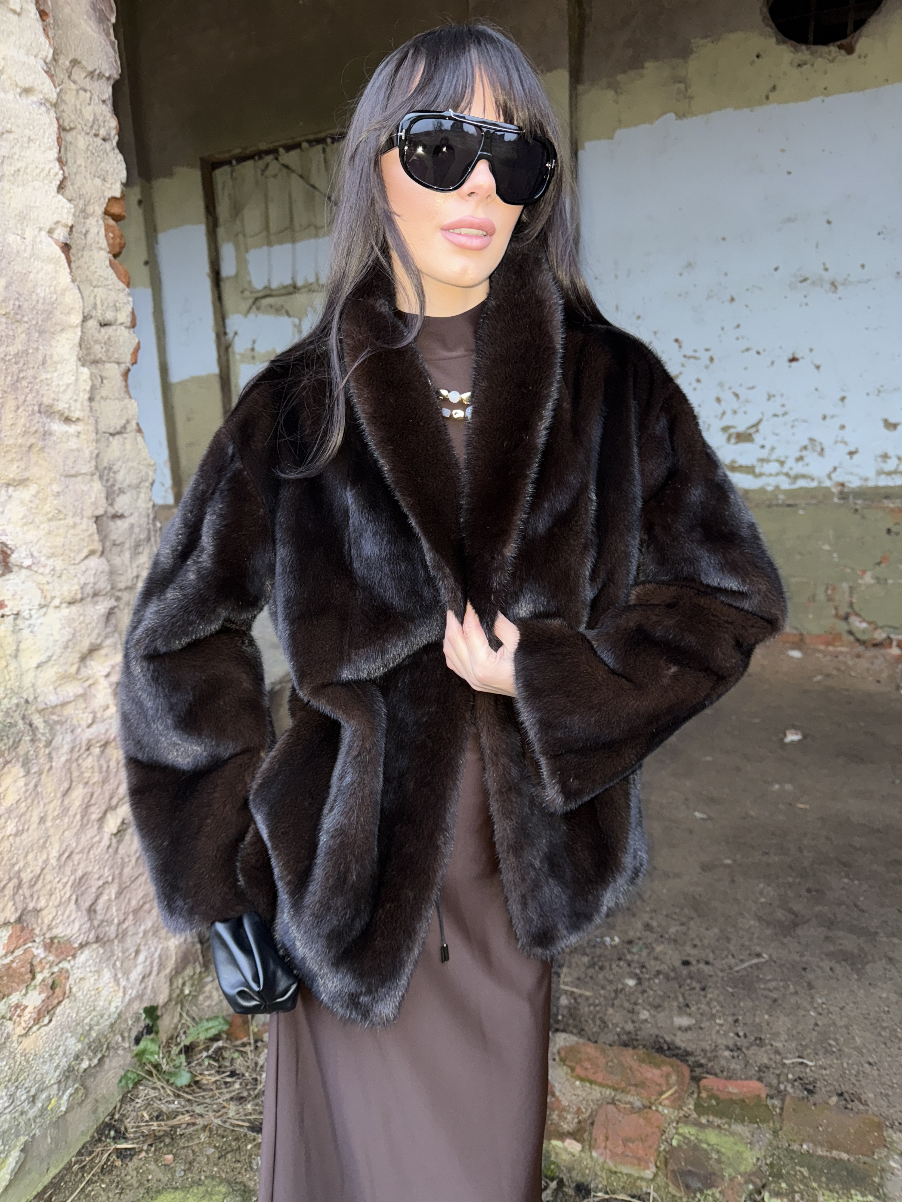 Natural mink fur coat in black chocolate color