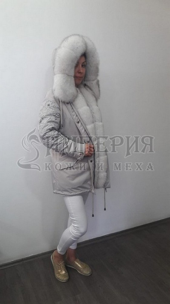 In the photo: There is a transverse layout of fur along the shelf (or whole skin). Hood to choose from: full fur or sheepskin inside.