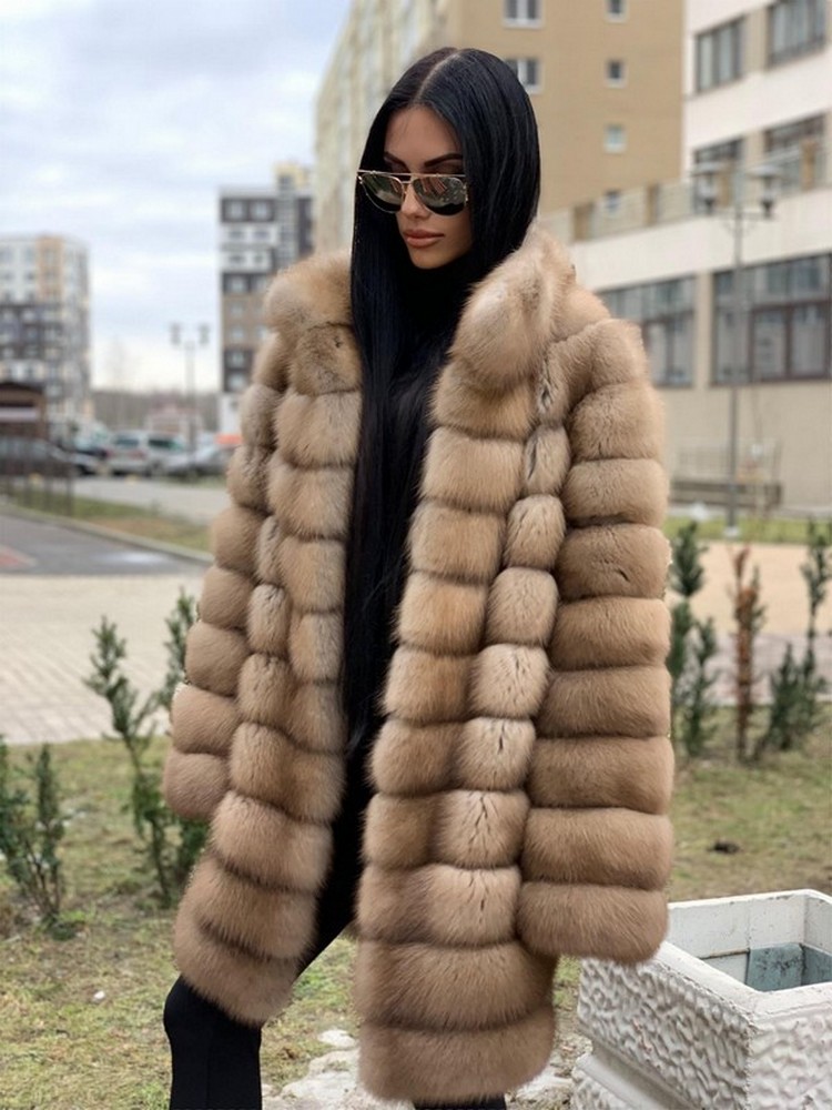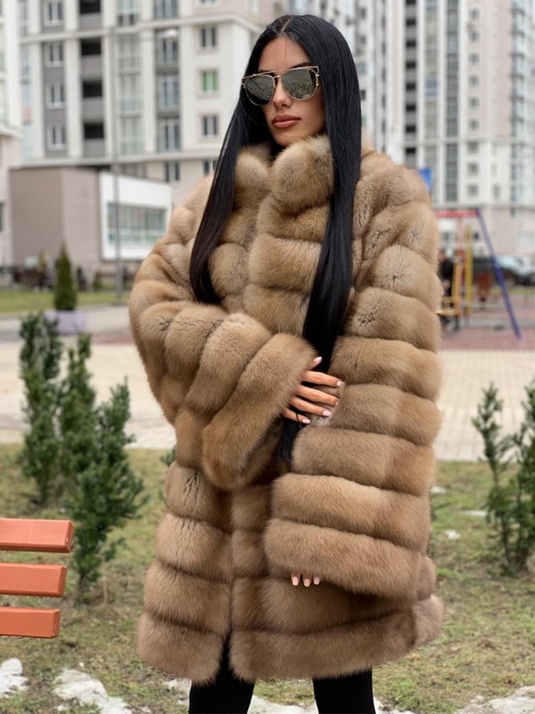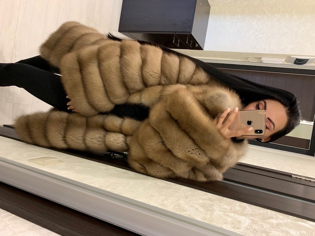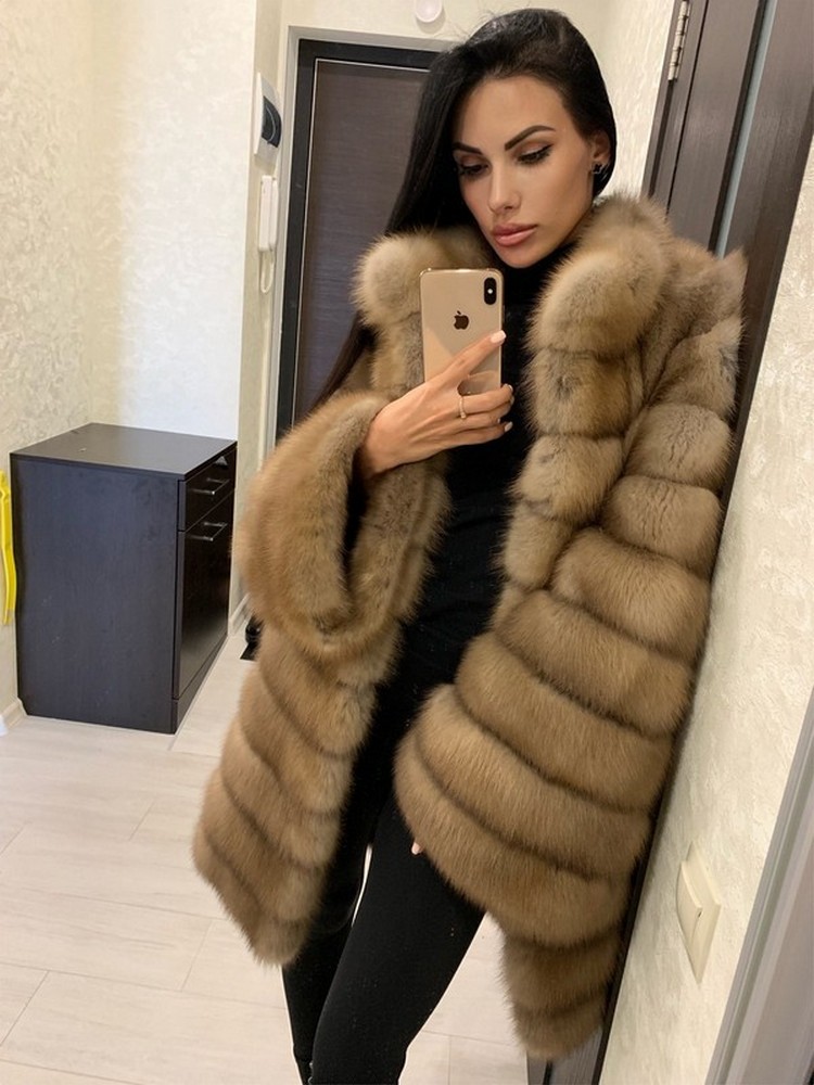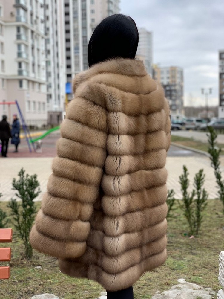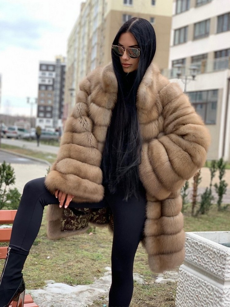 Transverse fur layout. Horizontal pockets with magnets. Stand collar, flared sleeves.