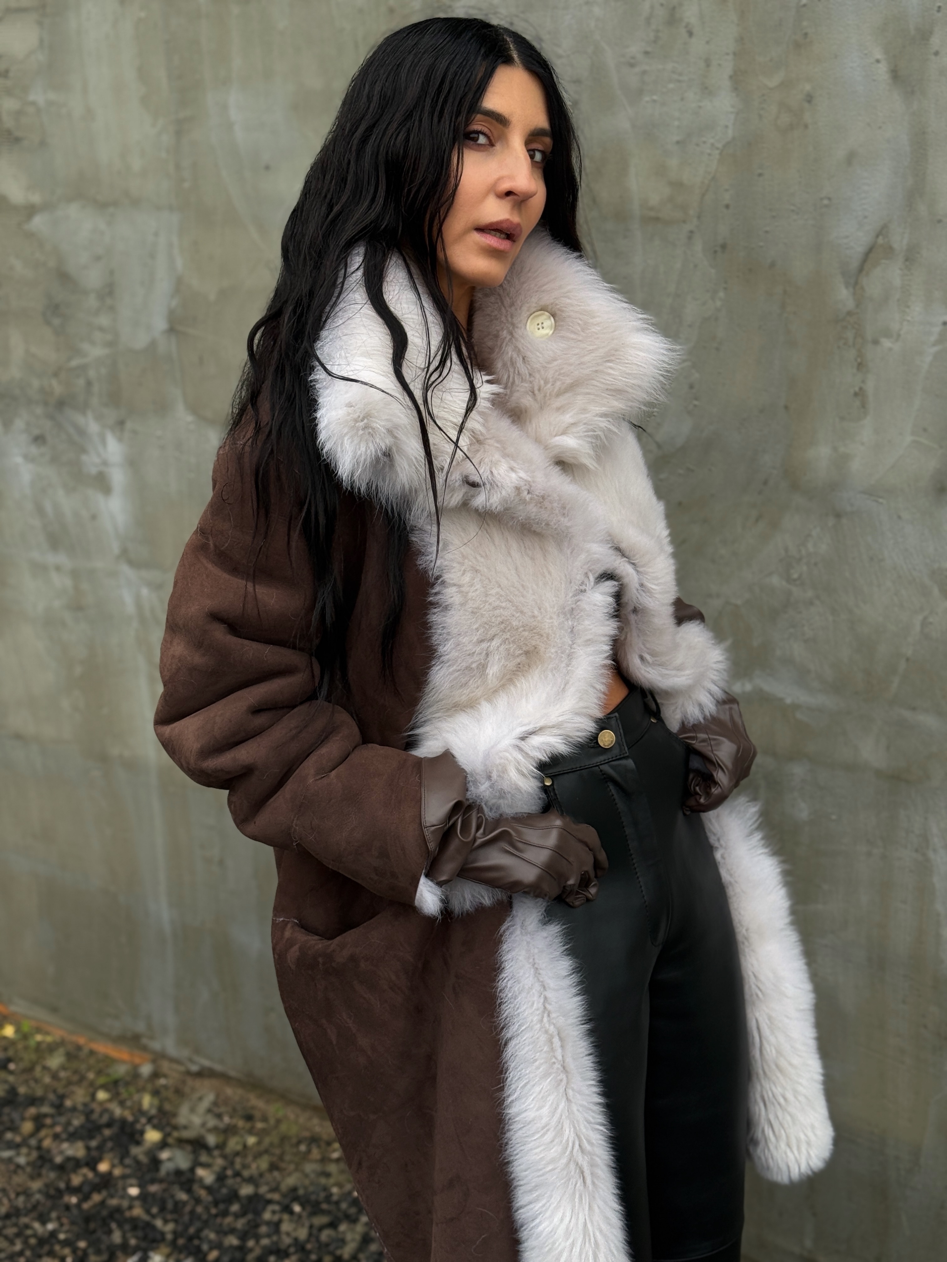 Double-sided brown and white sheepskin coat made of Tuscan fur