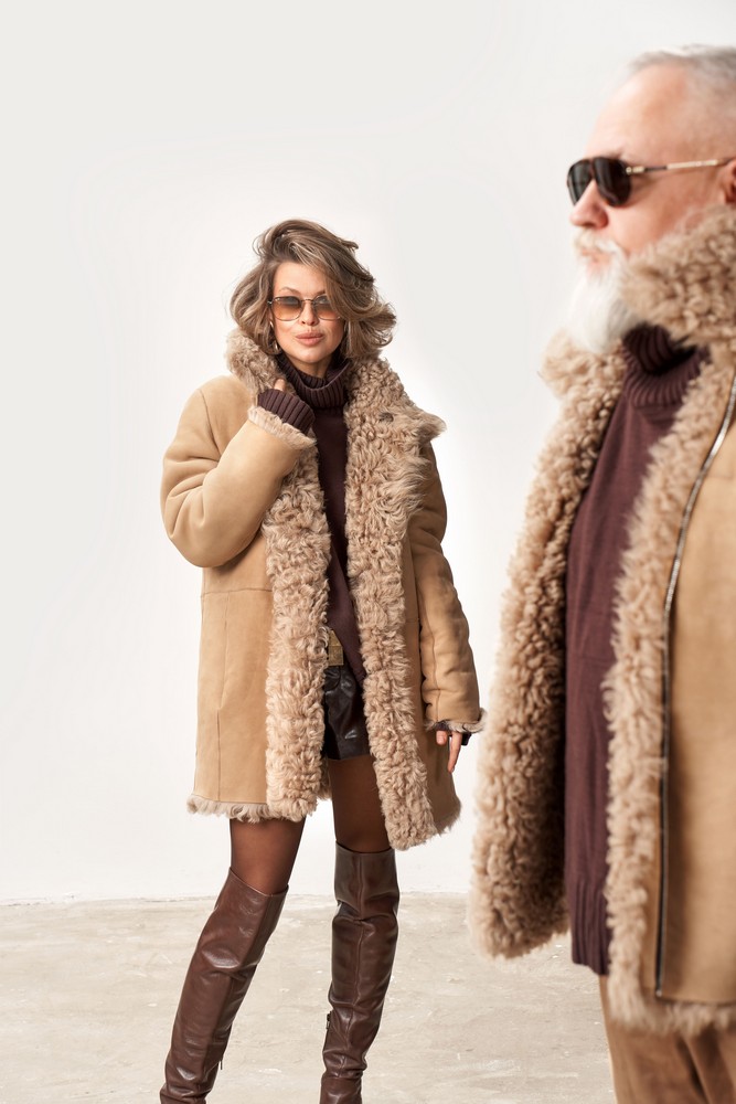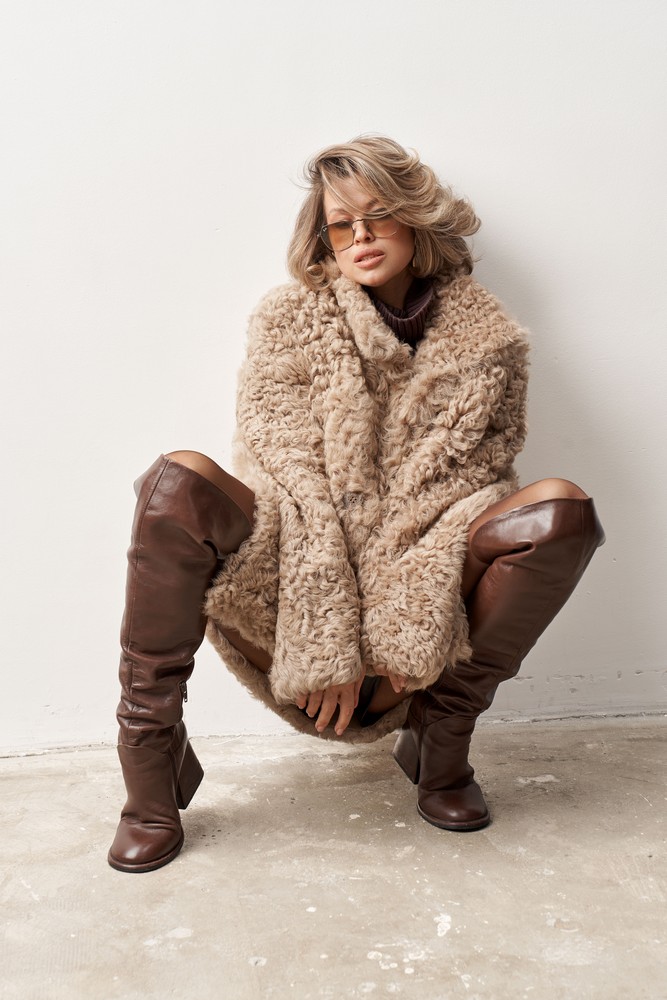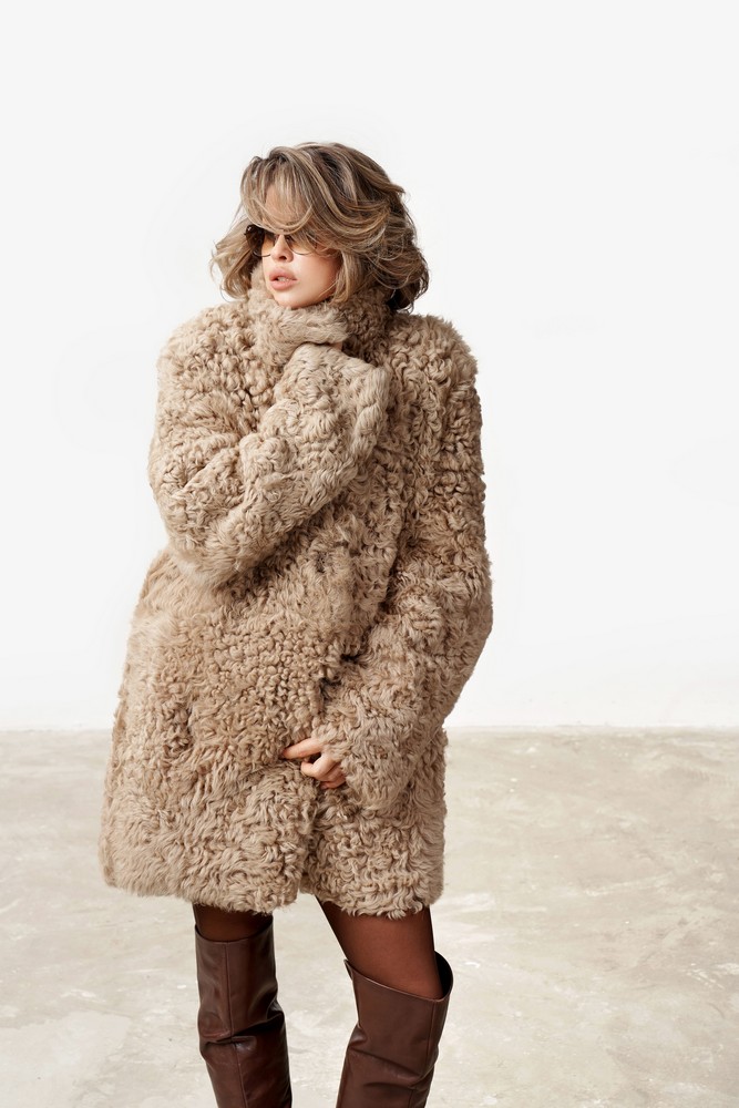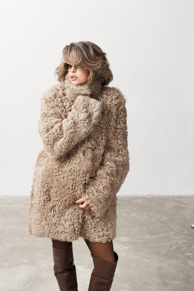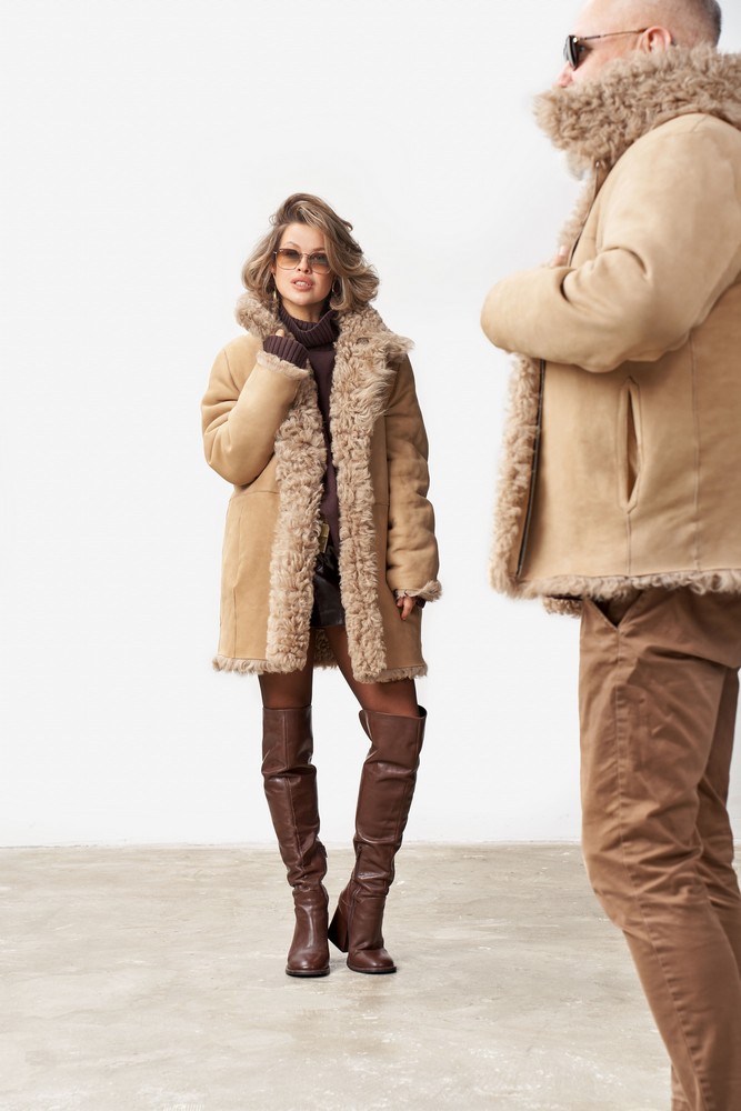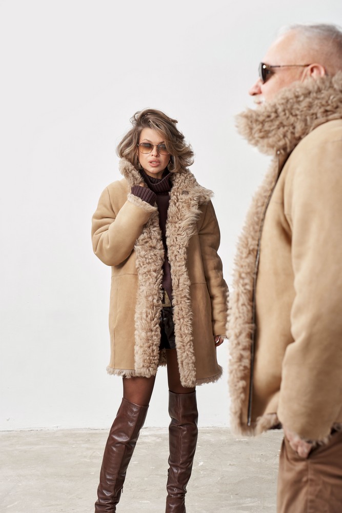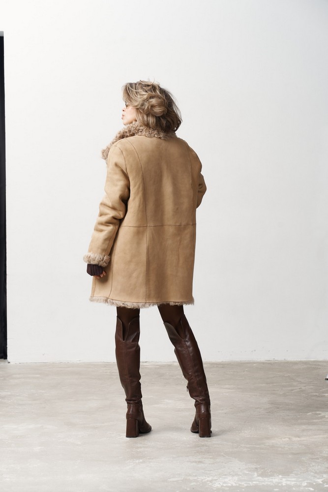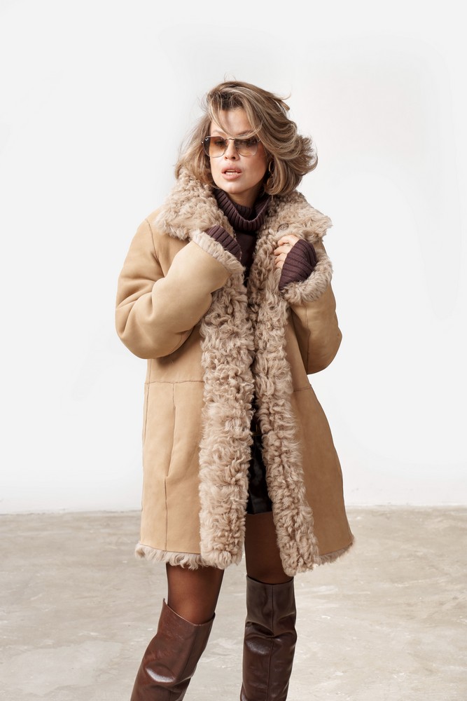 Double-sided sheepskin coat with tigrado fur in taupe caramel