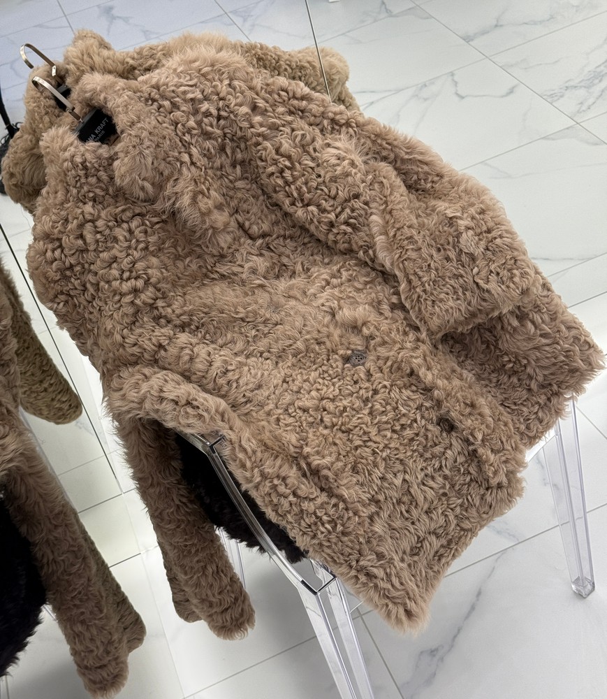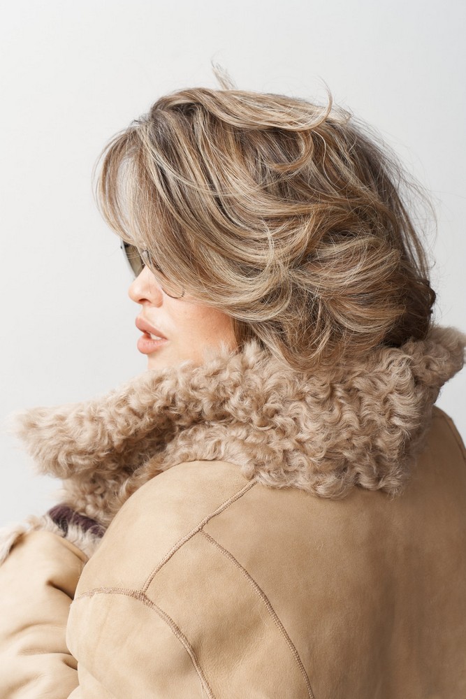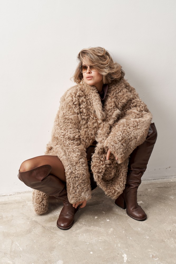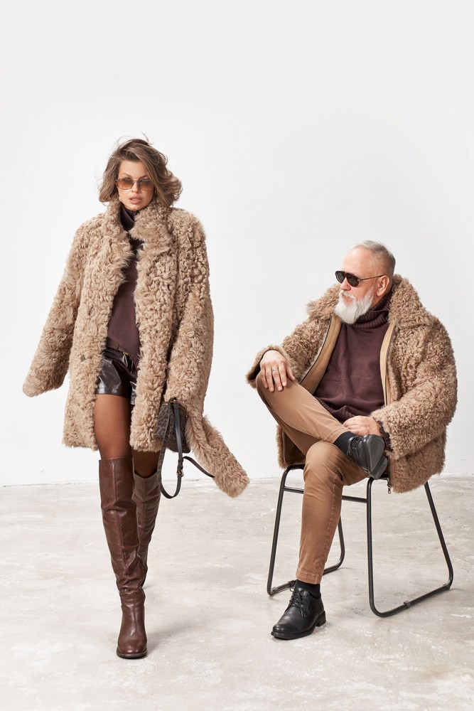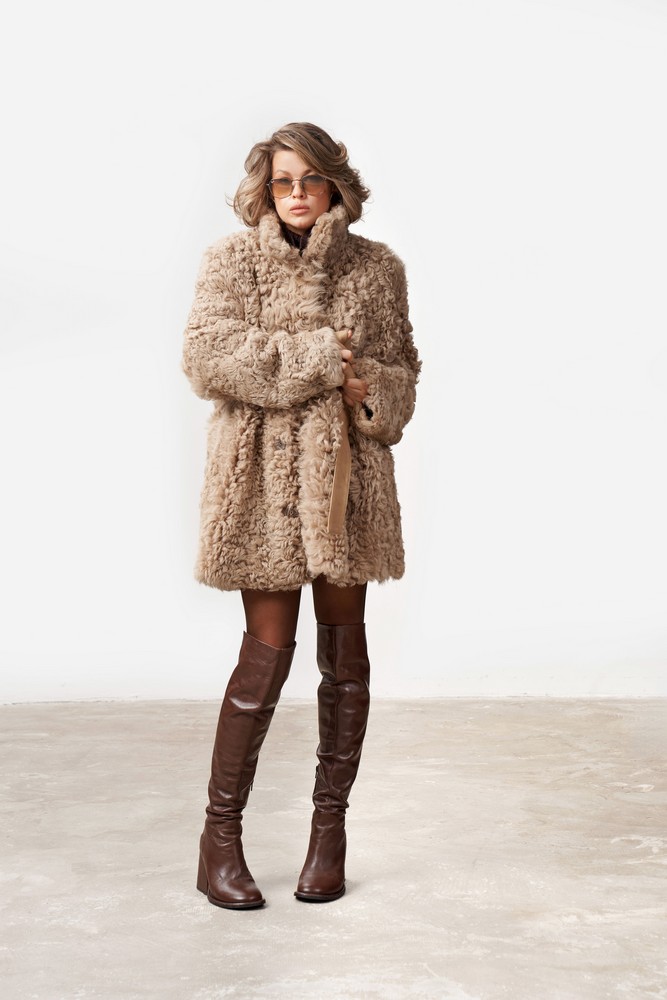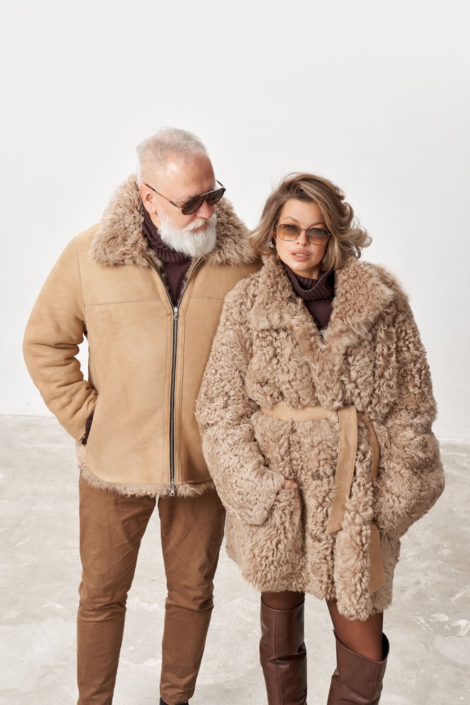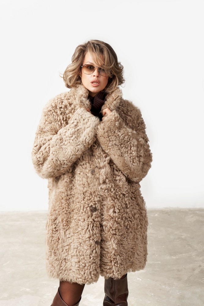 Double-sided sheepskin coat with tigrado fur in taupe caramel