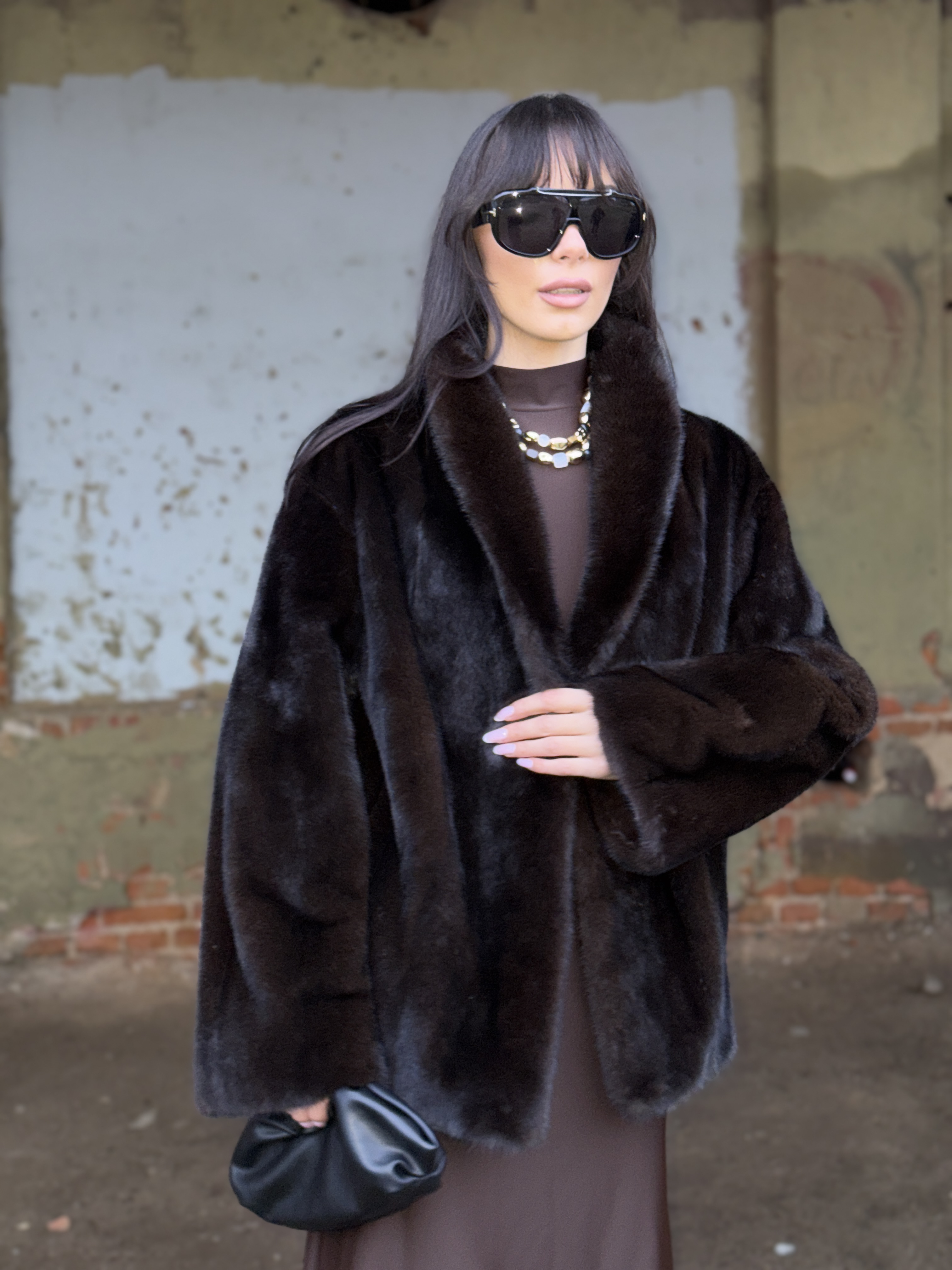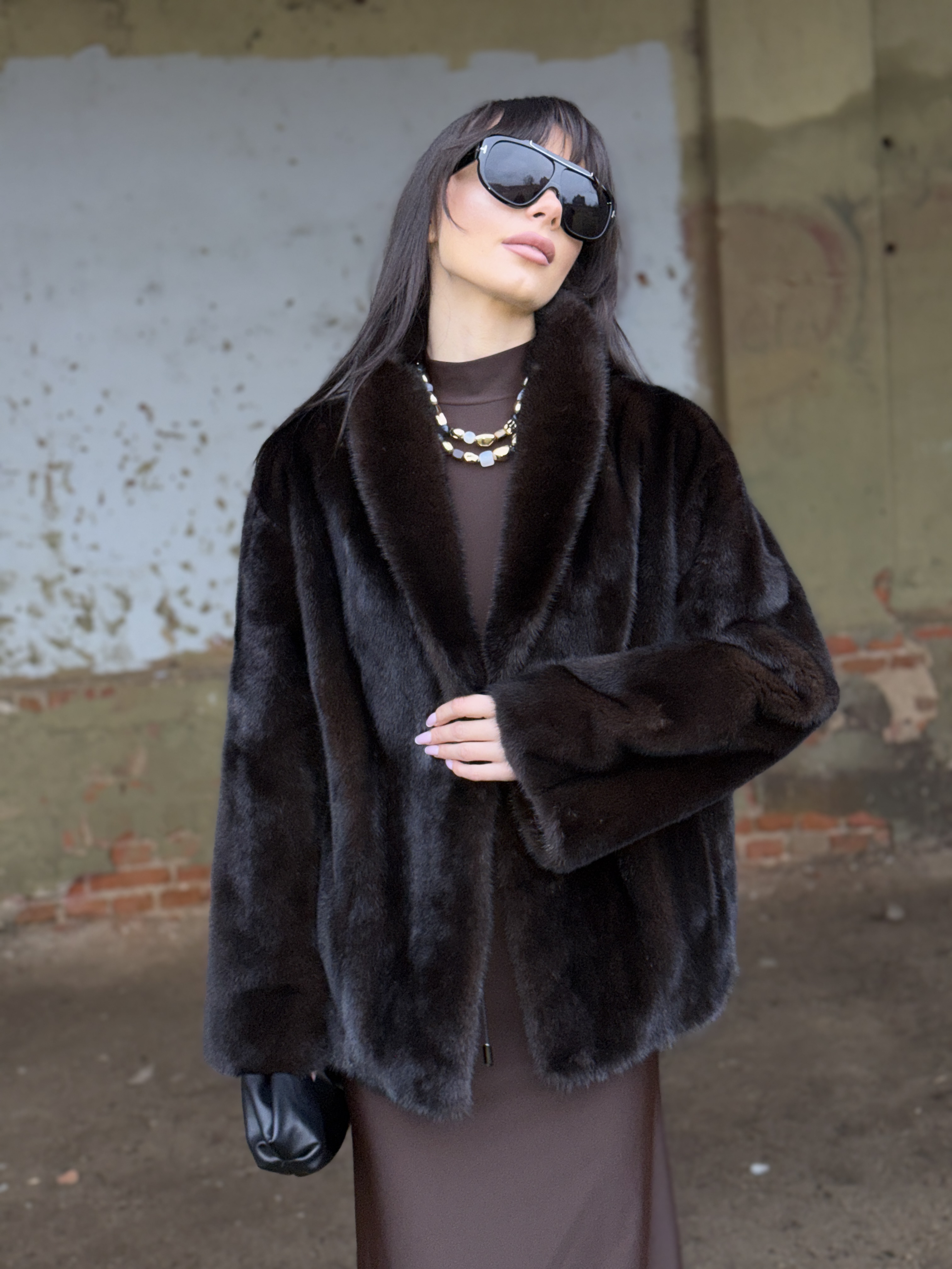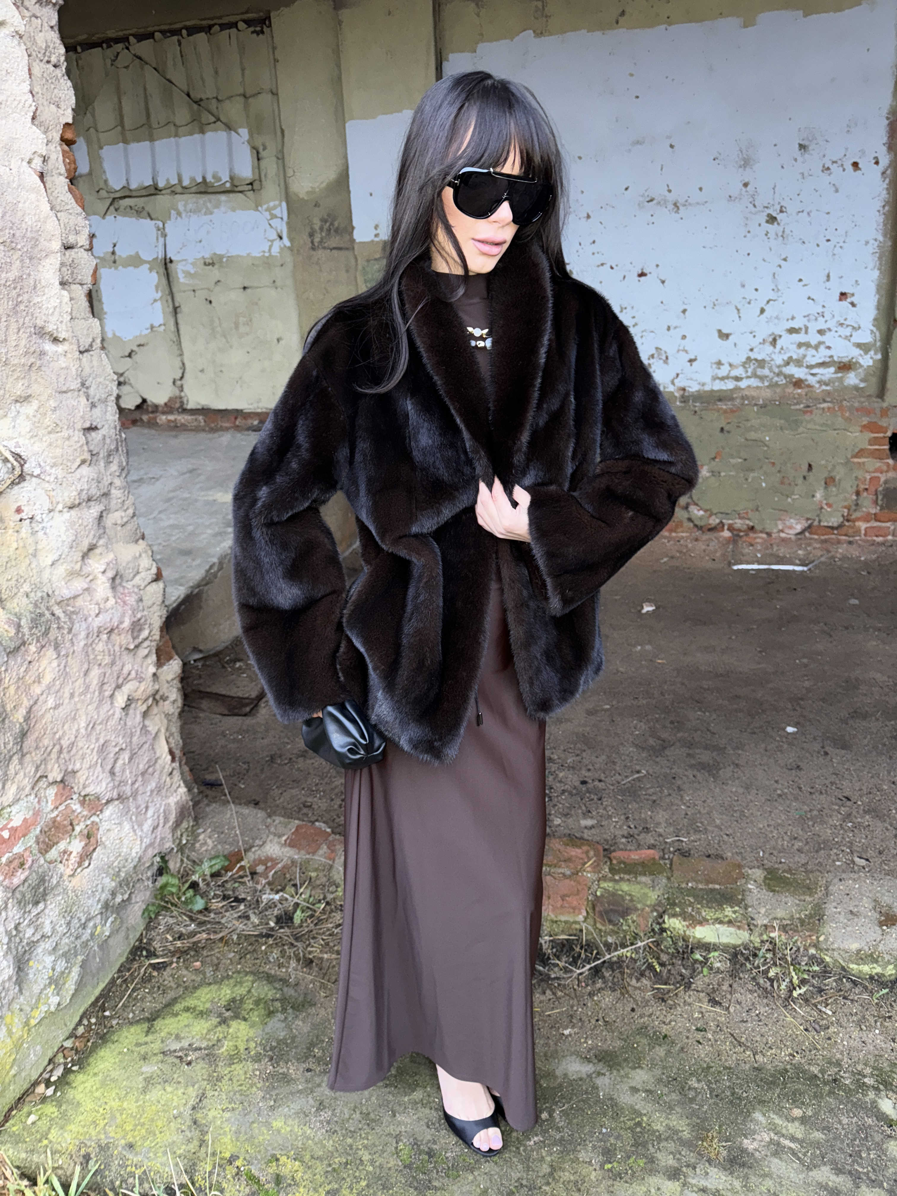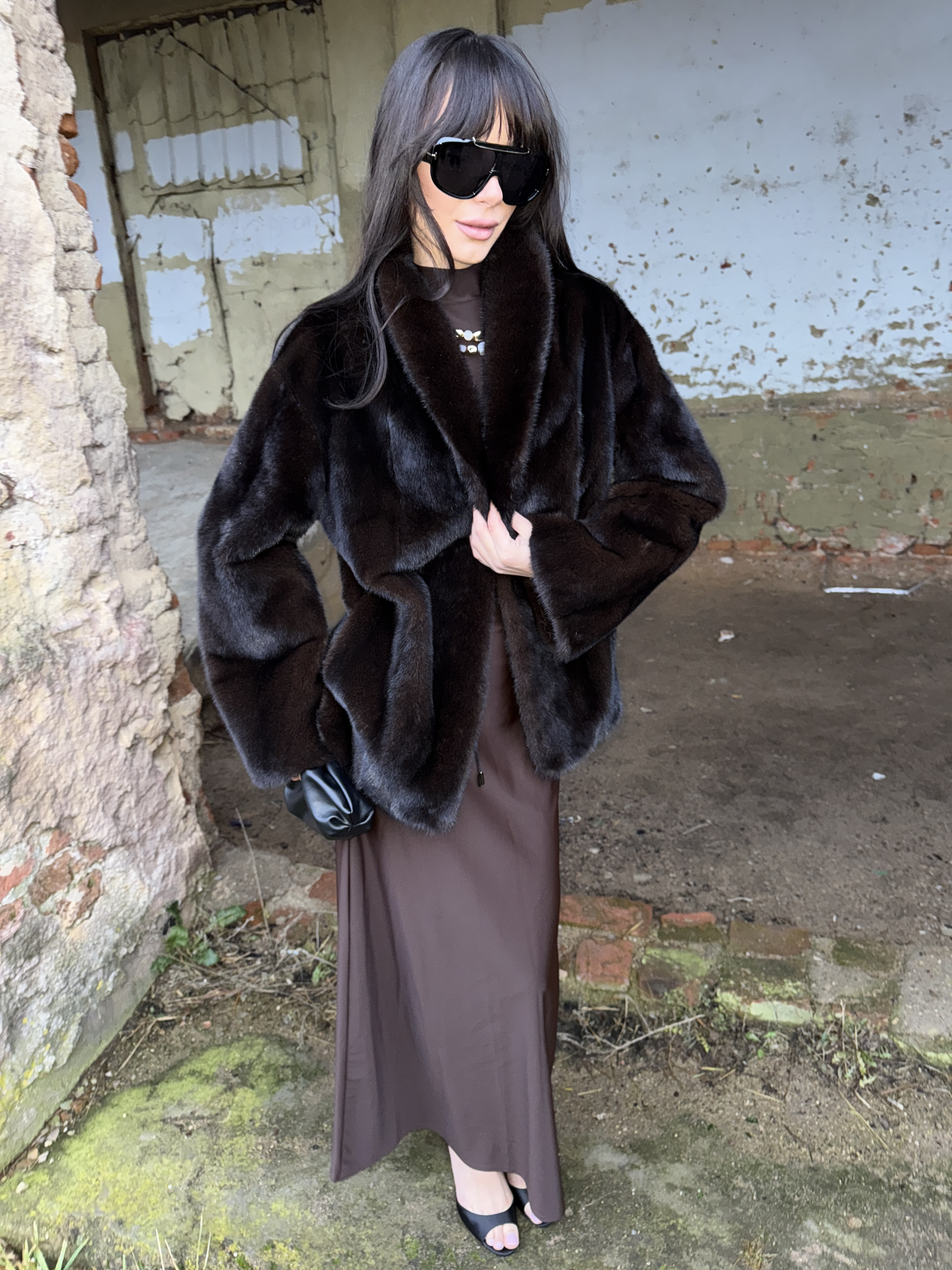 Natural mink fur coat in black chocolate color