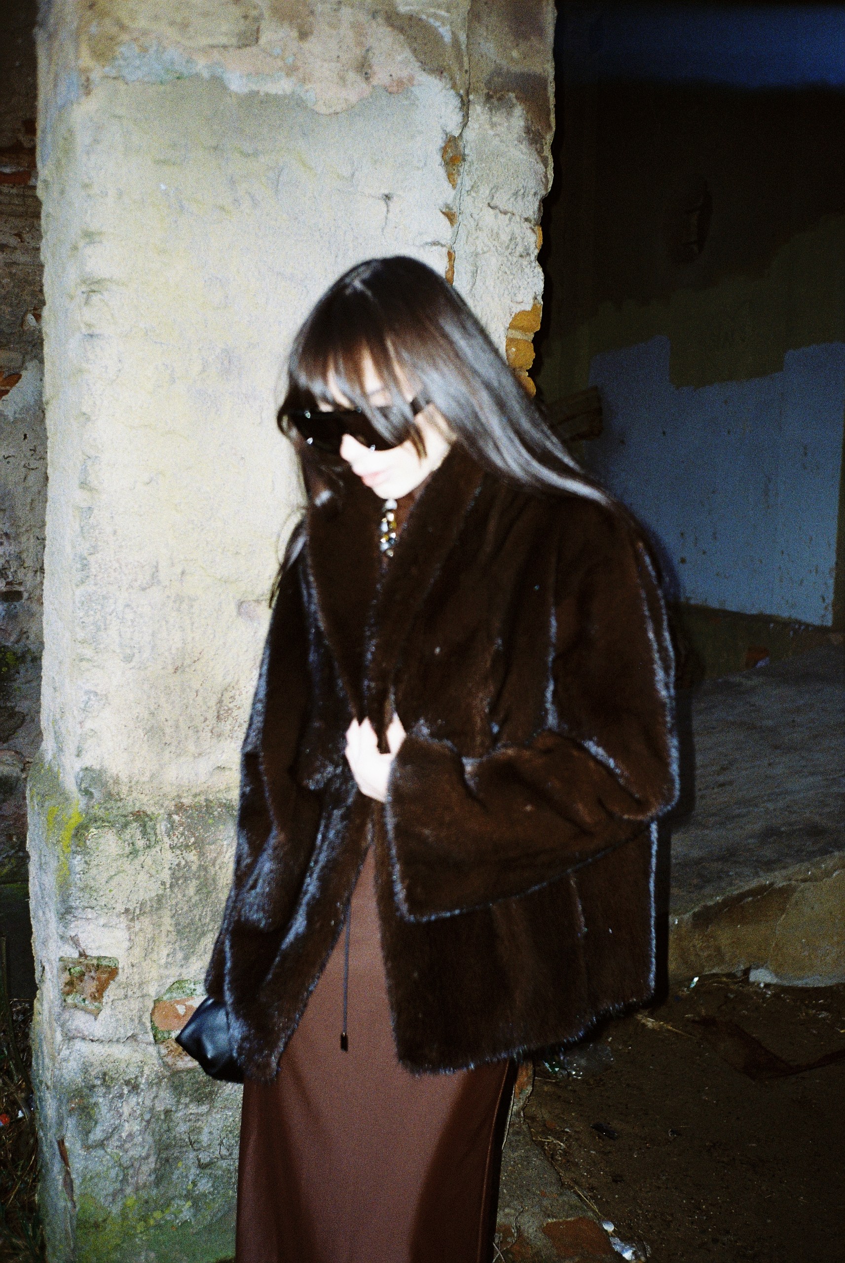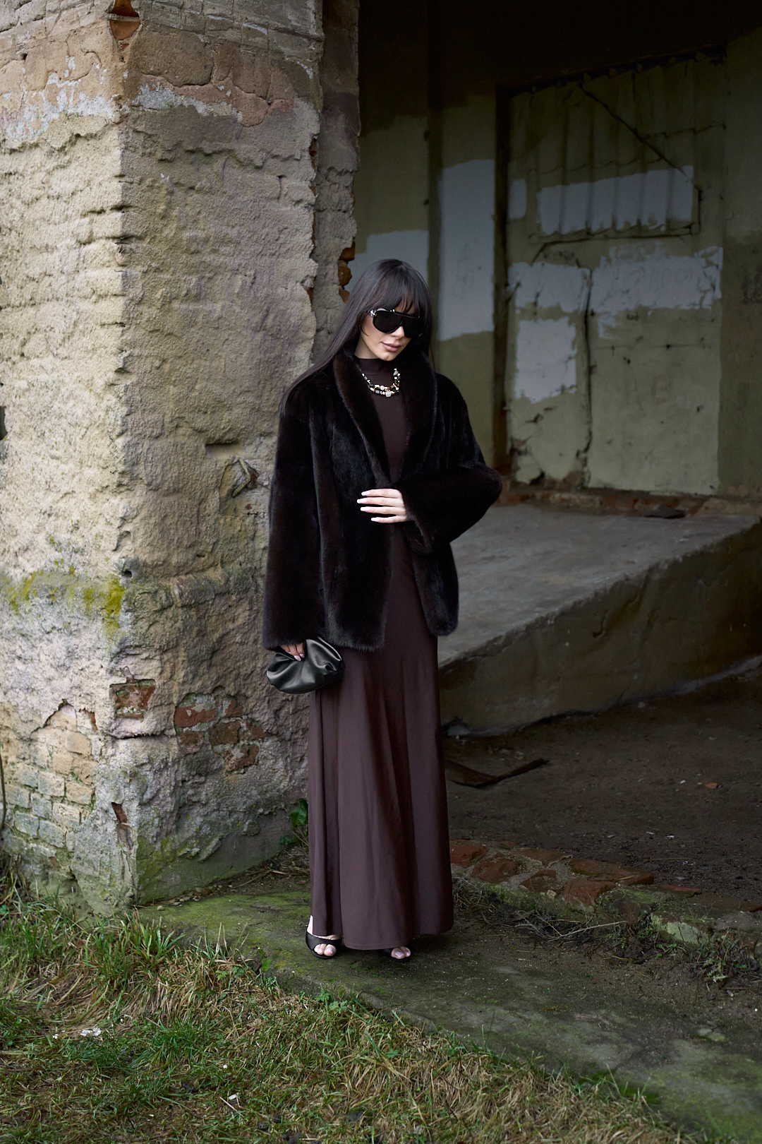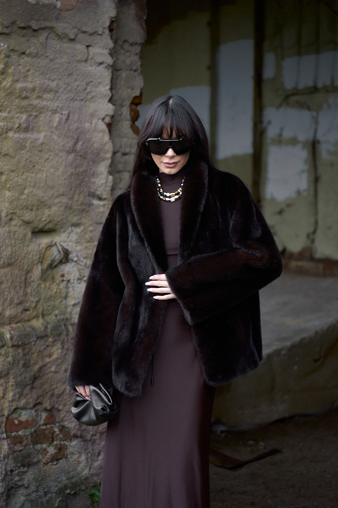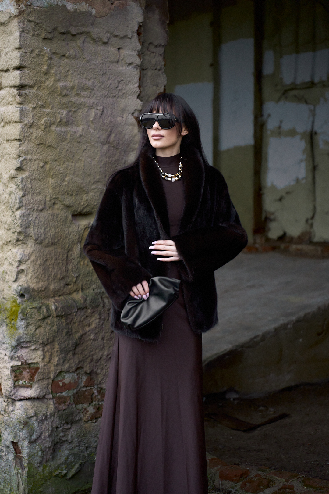 Natural mink fur coat in black chocolate color